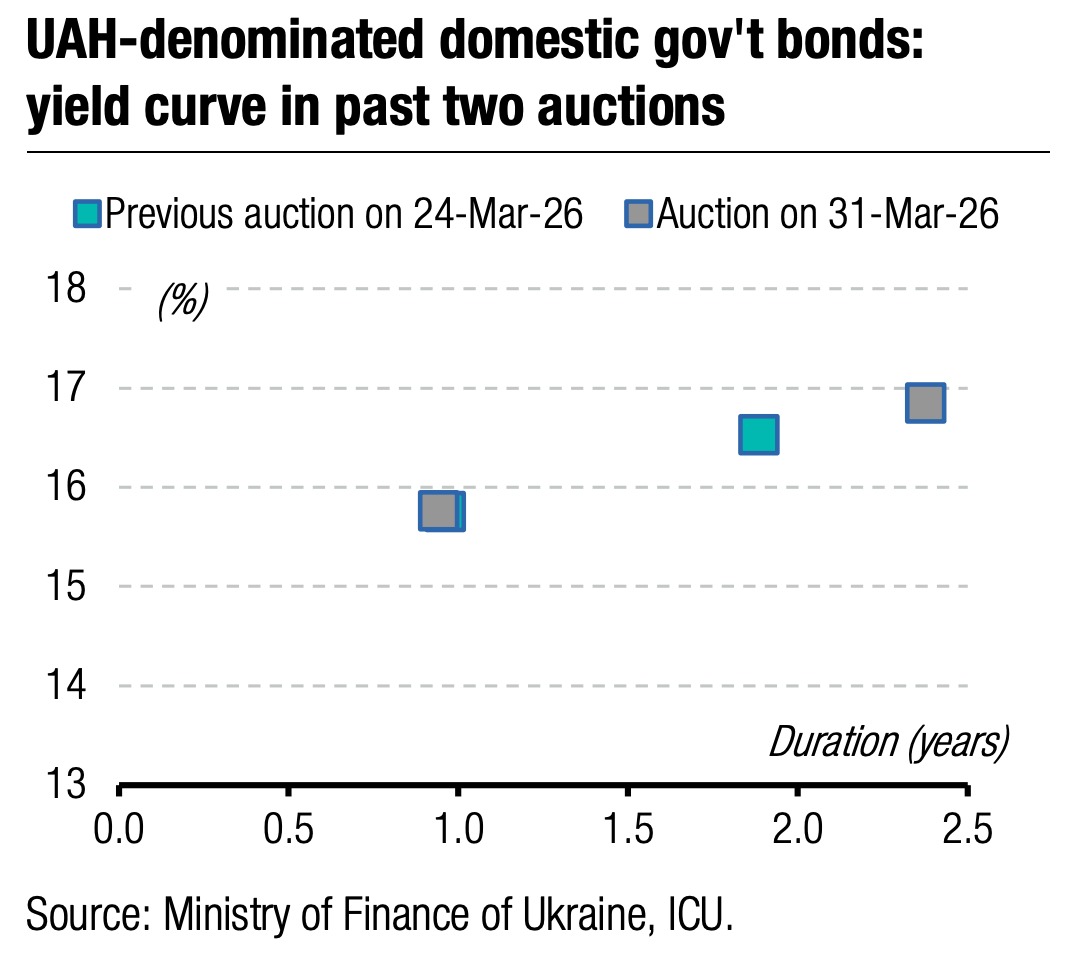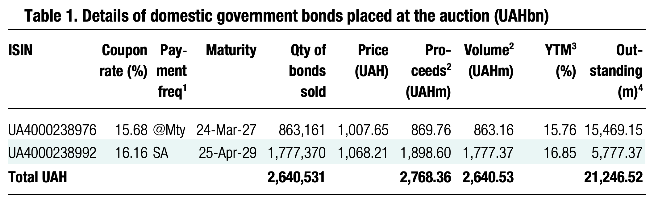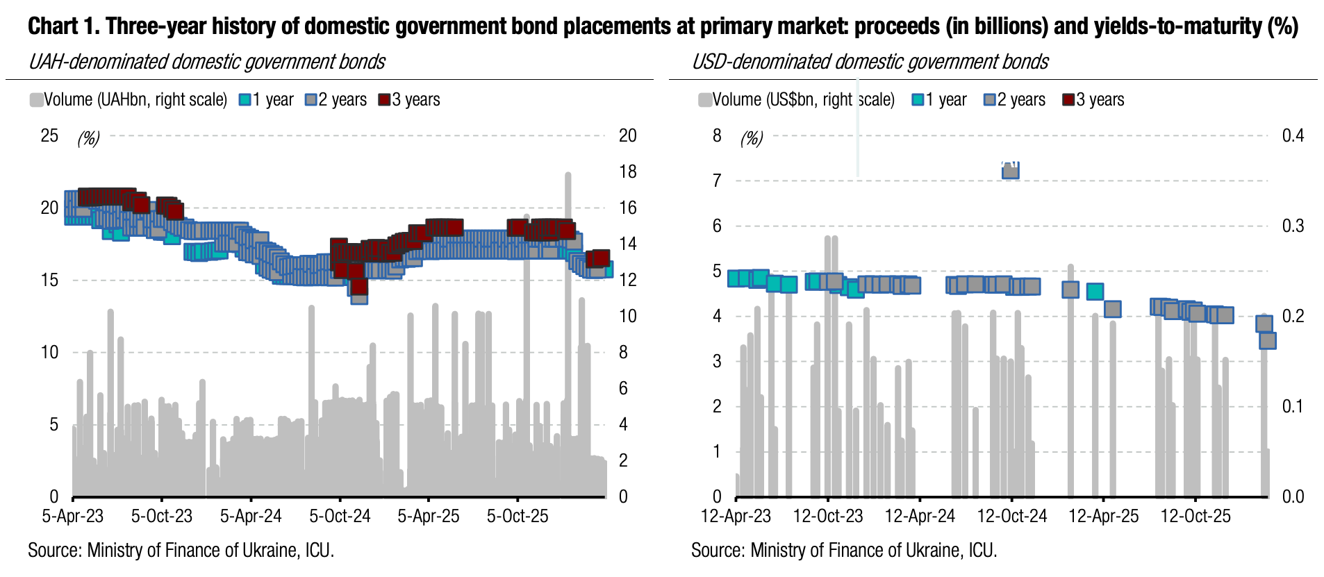 Note: [1] payment frequency abbreviations: M - monthly, Qtly - quarterly, SA - semi-annually, @Mty - at maturity date; [2] proceeds and volumes for the USD-denominated bonds are calculated based on the previous day's exchange rate 43.91/USD, 50.95/EUR; [3] yields on coupon-bearing bonds are effective yields to maturity. Sources: Ministry of Finance of Ukraine, Bloomberg, ICU.