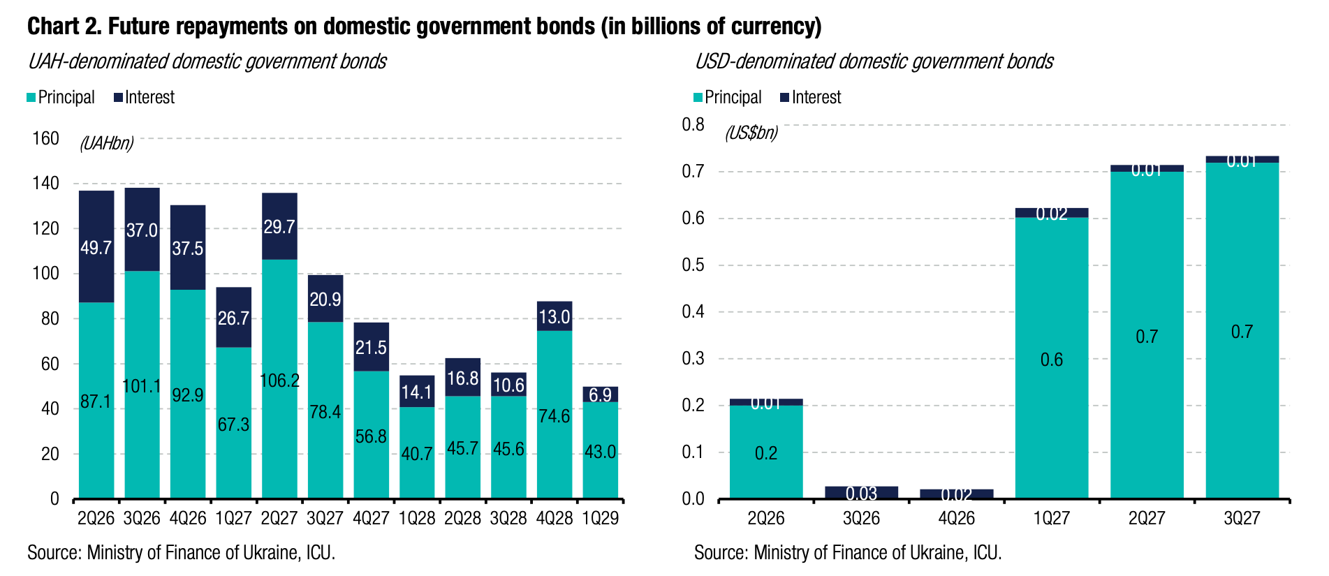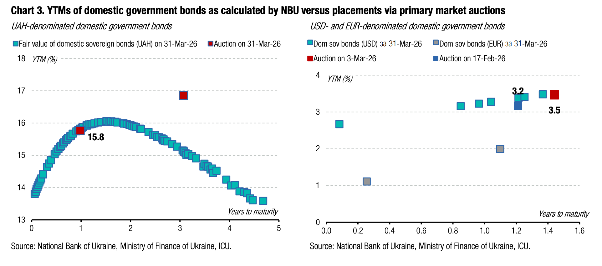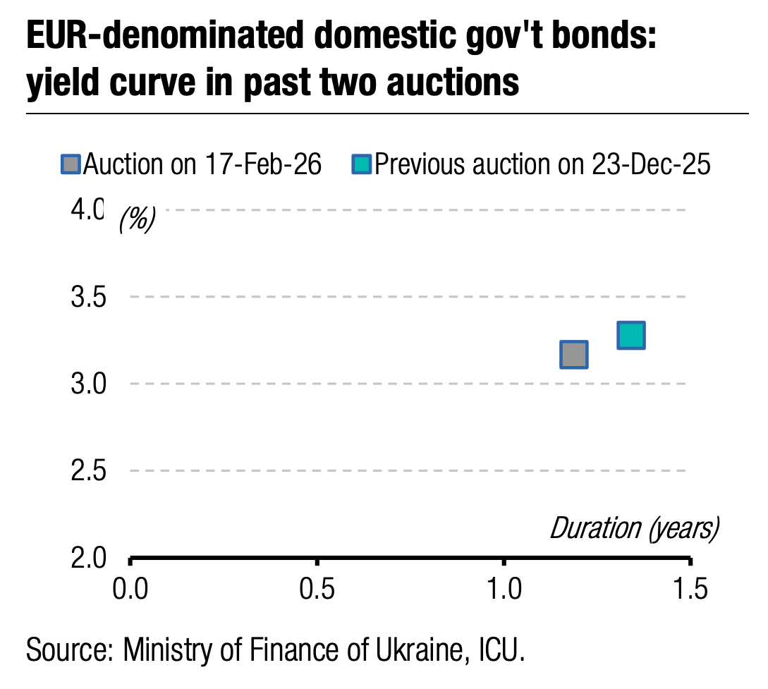 Note: [1] payment frequency abbreviations: M - monthly, Qtly - quarterly, SA - semi-annually, @Mty - at maturity date; [2] proceeds and volumes for the USD-denominated bonds are calculated based on the previous day's exchange rate 43.91/USD, 50.95/EUR; [3] yields on coupon-bearing bonds are effective yields to maturity. Sources: Ministry of Finance of Ukraine, Bloomberg, ICU.