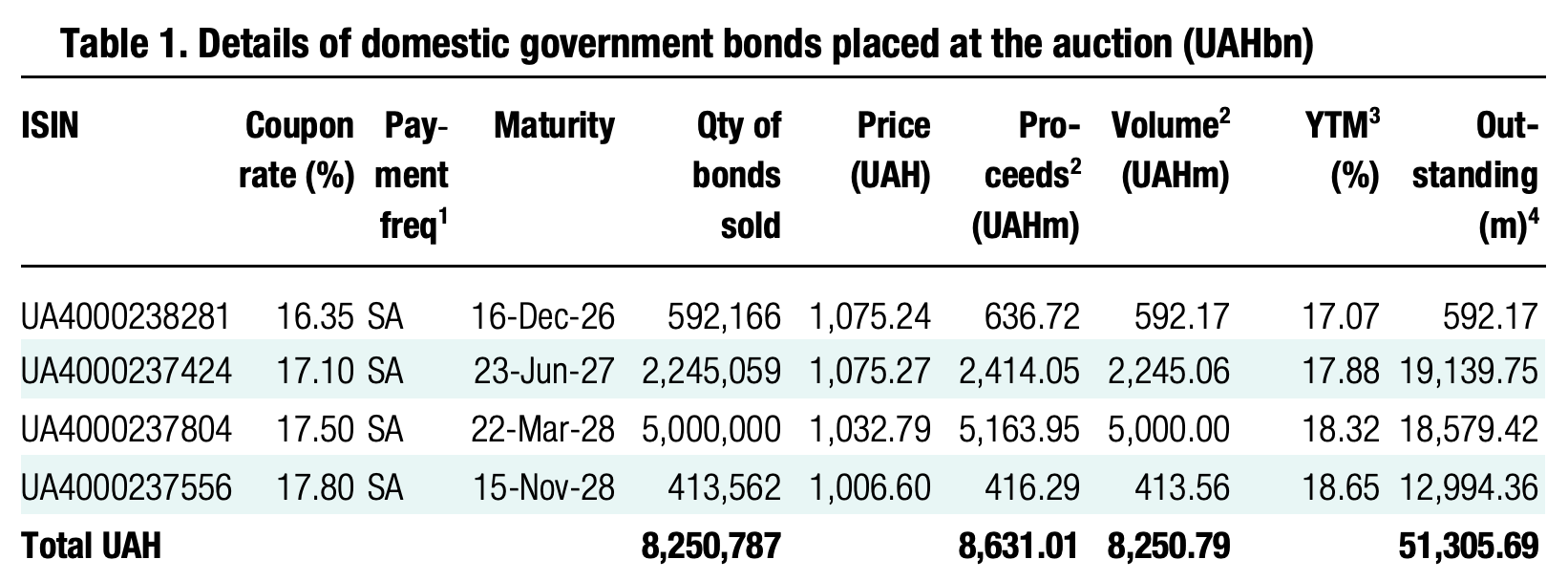 The 19-month ordinary bonds received UAH2.2bn of demand, also at the usual interest rates, so the Ministry of Finance satisfied all bids.