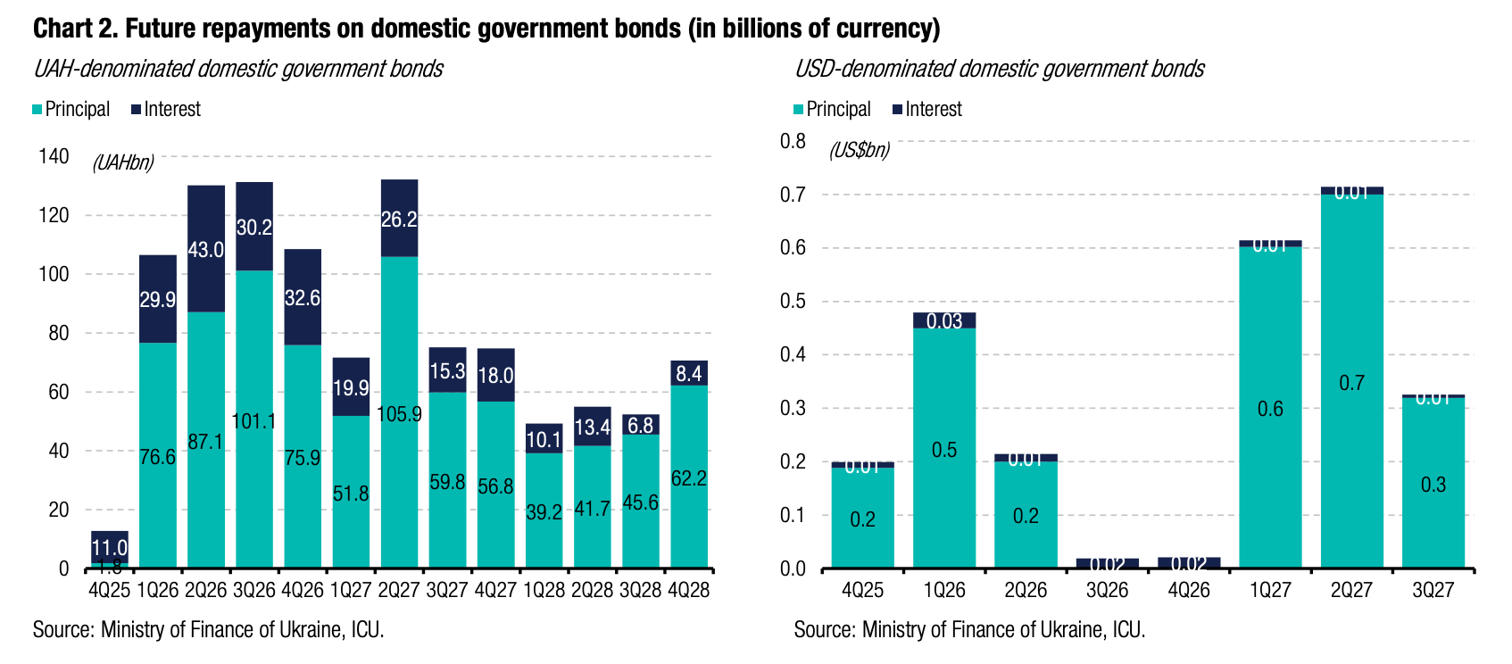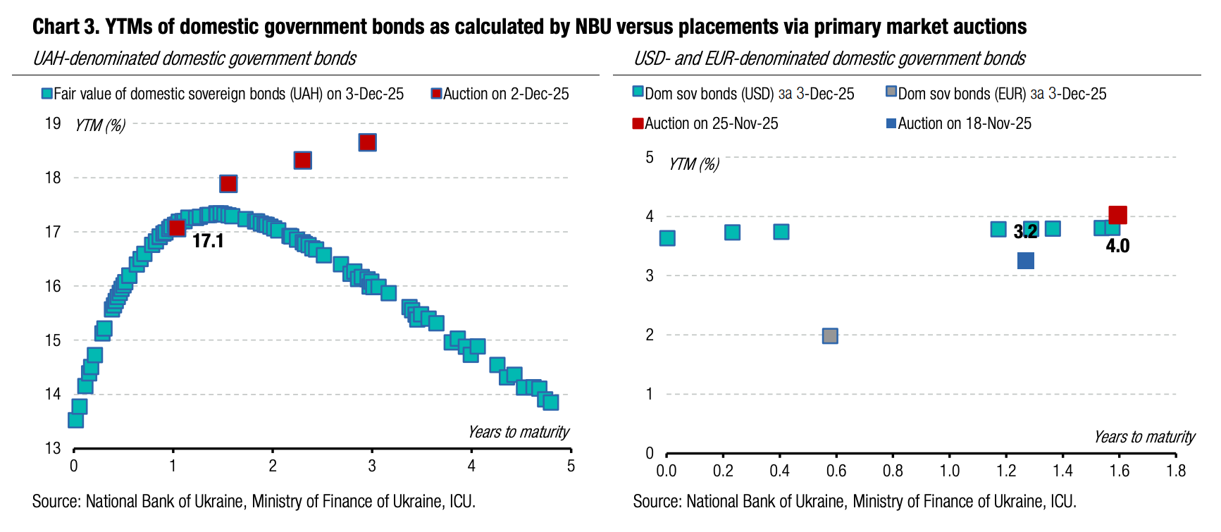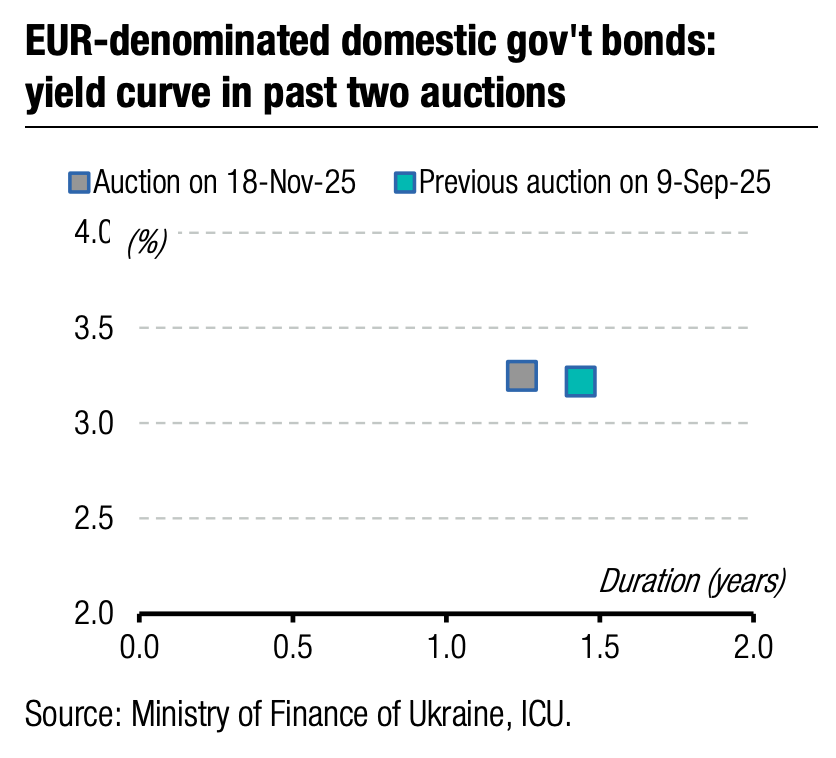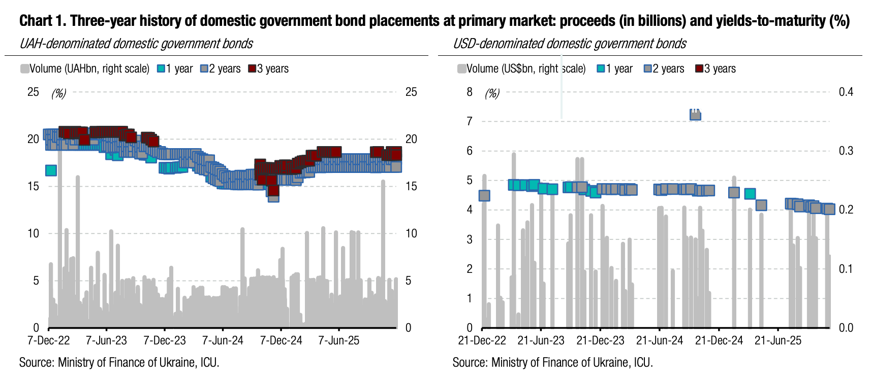 Note: [1] payment frequency abbreviations: M - monthly, Qtly - quarterly, SA - semi-annually, @Mty - at maturity date; [2] proceeds and volumes for the USD-denominated bonds are calculated based on the previous day's exchange rate 42.27/USD, 48.57/EUR; [3] yields on coupon-bearing bonds are effective yields to maturity. Sources: Ministry of Finance of Ukraine, Bloomberg, ICU.