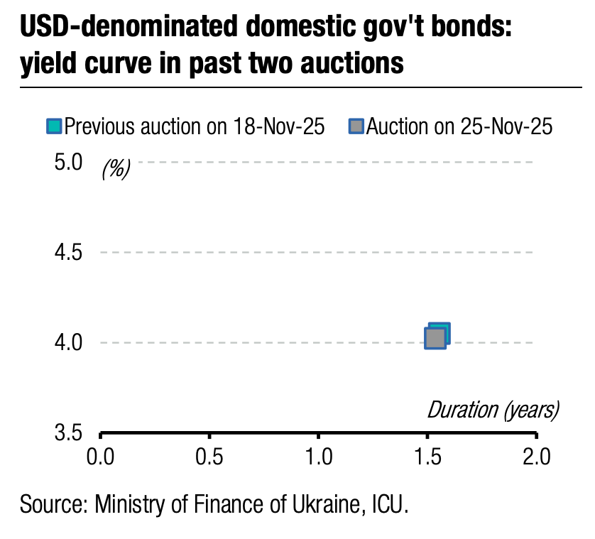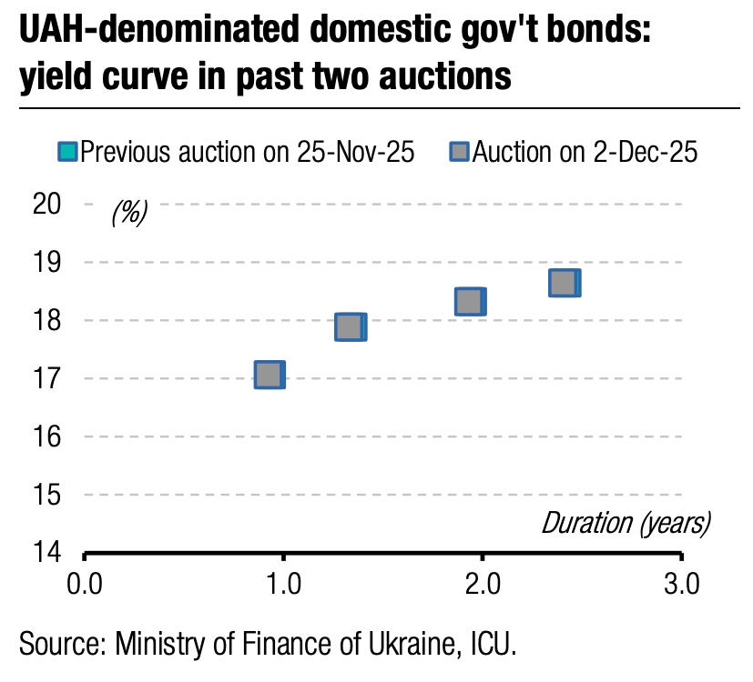 The MoF replaced the shortest military paper with a new bill maturing in mid-December 2026. Due to the novelty of the bond, interest in it was insignificant, with demand slightly below UAH0.6bn. The rates in the bids were the same as for the one-year instrument placed earlier, so the cut-off and weighted average rates remain at 16.35%.