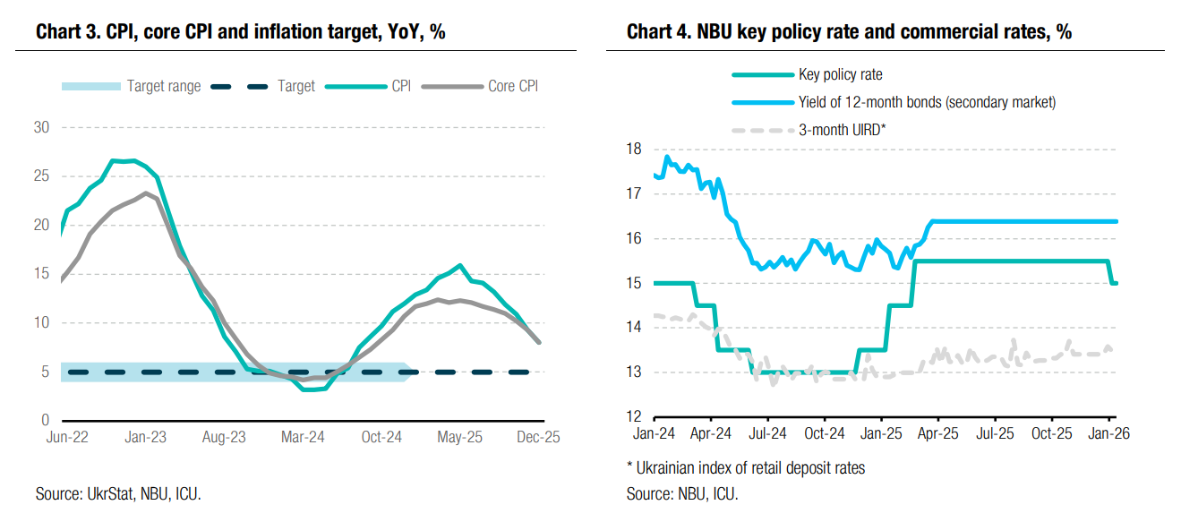 Rapid deceleration of inflation is one of the brightest spots of current economic realities, and we expect inflationary pressures will remain muted through 2026. NBU’s recent guidance on the key policy rate path came as a big surprise to us as we expected more bold moves to ease monetary conditions. We interpret NBU key rate signals as a confirmation that it intends to further weaken the hryvnia in 2026 in an important deviation from last year’s policy of, effectively, a fixed exchange rate.
