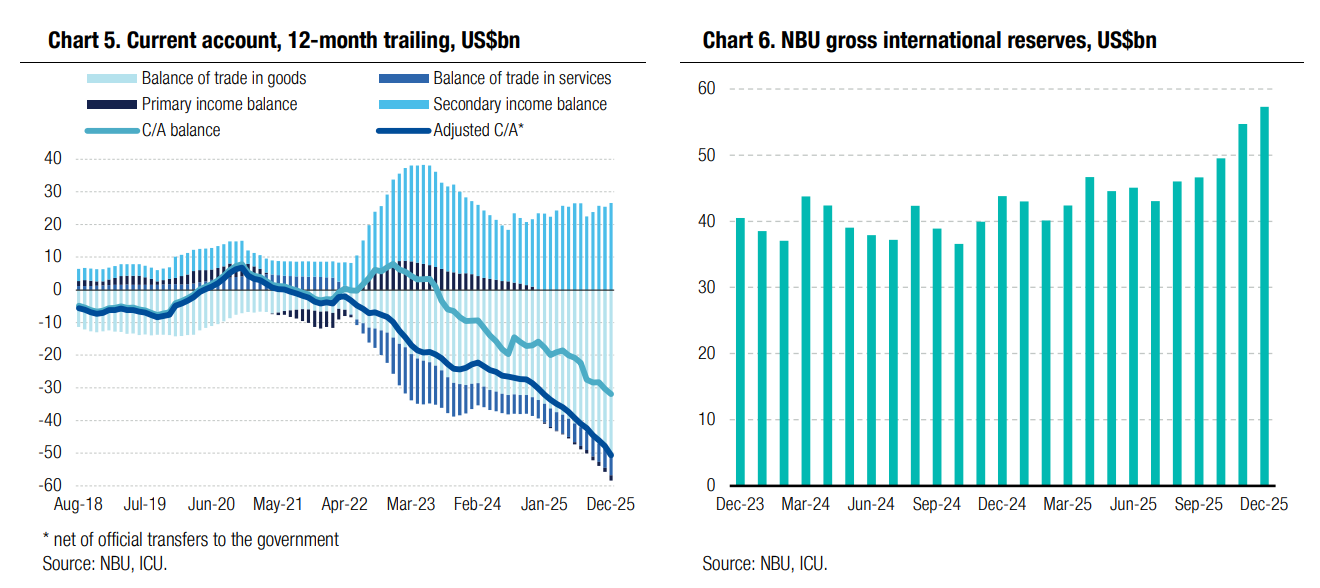 The fiscal deficit widened last year, but we expect that will reverse in 2026. Over 98% of the gap will be covered with external financing. The IMF program will contain sensitive tax issues, as the fund will want to ensure that the country can mobilize more resources domestically should the expenses on defense increase vs the current plan.