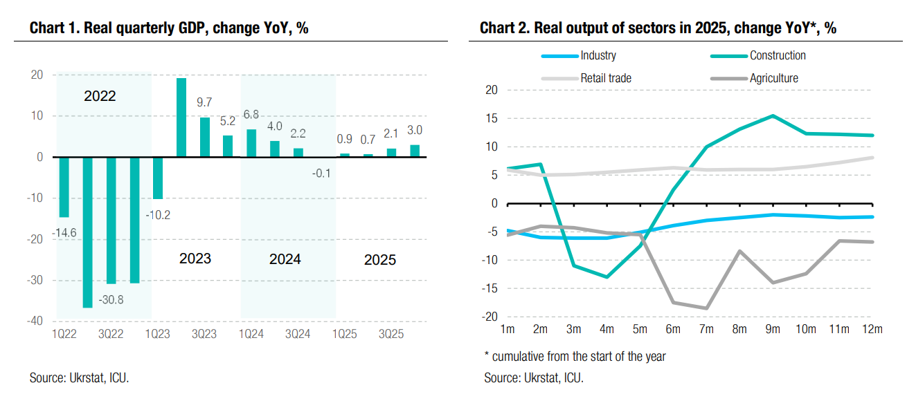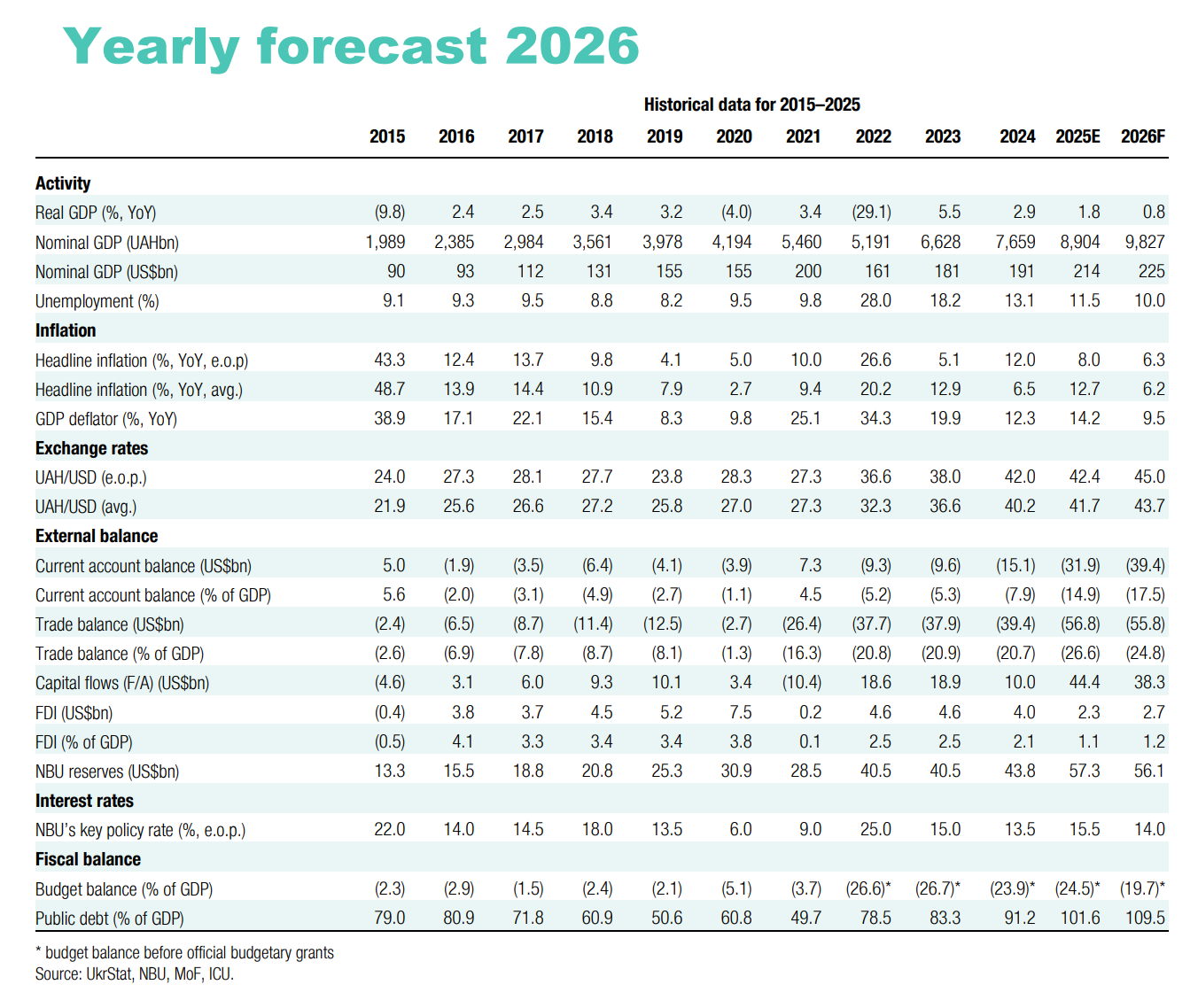 The economy is set to slow further as headwinds remain intense. The energy crisis caused by russia’s terror attacks on civil infrastructure is interrupting production cycles in many sectors and damaging consumer sentiment. If safety risks don’t subside dramatically in 2026 – which is our conservative baseline assumption – the economy will struggle to grow. Nonetheless, the continued inflows of foreign financial aid imply the economy will remain on a footing that is sufficiently strong and risks to a broad macroeconomic stability are reasonably low.