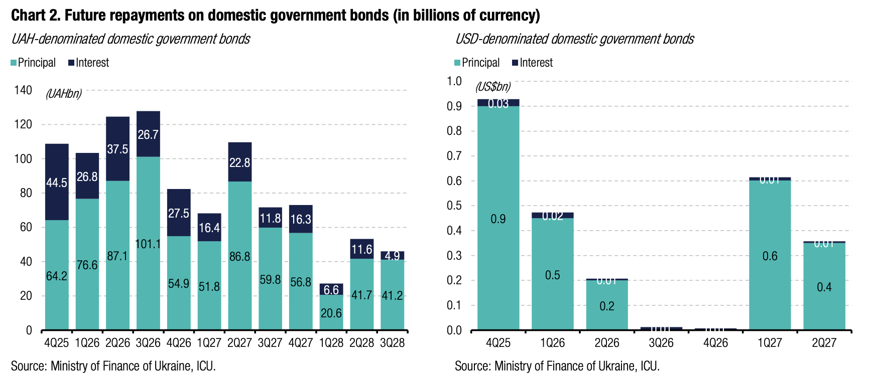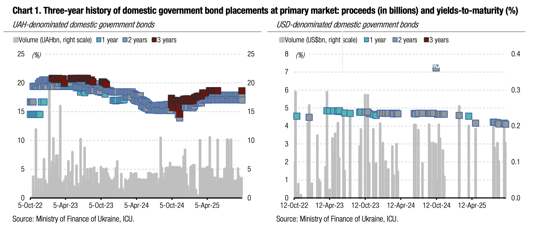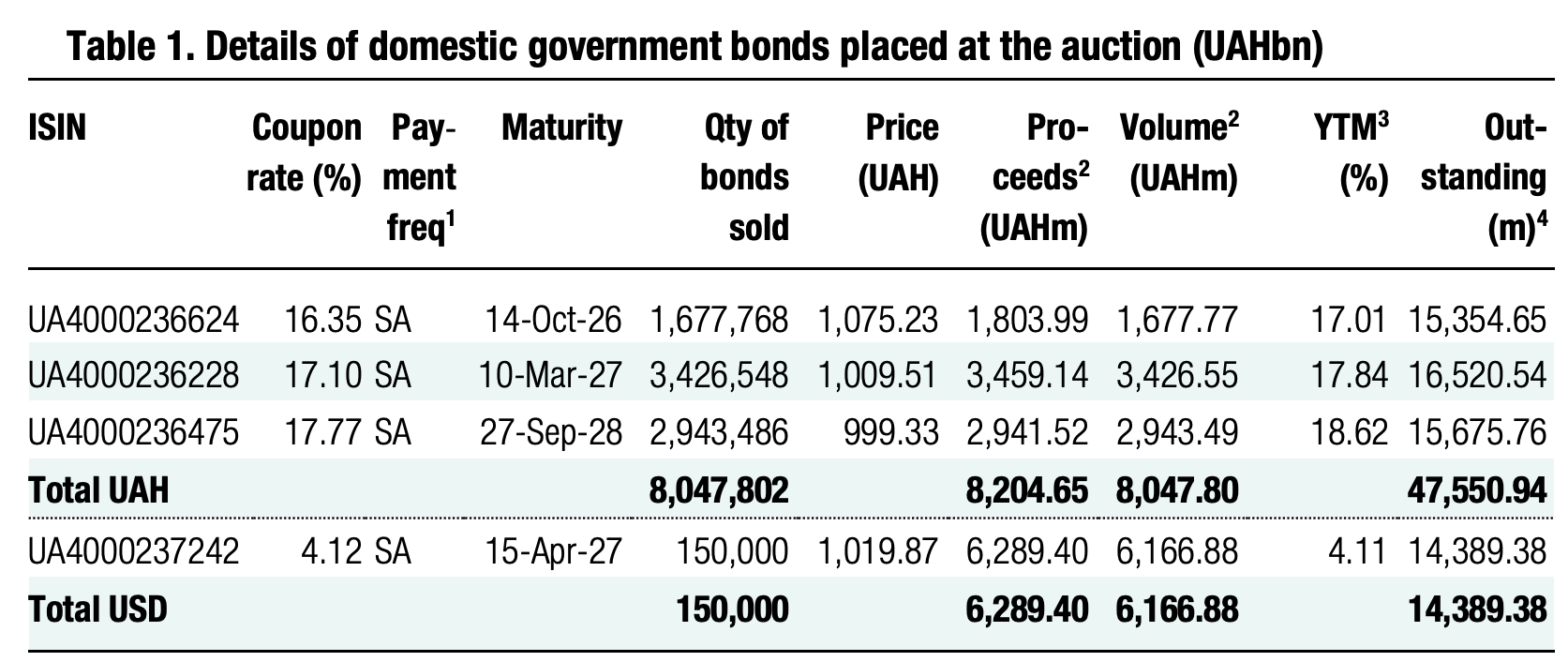 Note: [1] payment frequency abbreviations: M - monthly, Qtly - quarterly, SA - semi-annually, @Mty - at maturity date; [2] proceeds and volumes for the USD-denominated bonds are calculated based on the previous day's exchange rate 41.11/USD, 48.29/EUR; [3] yields on coupon-bearing bonds are effective yields to maturity. Sources: Ministry of Finance of Ukraine, Bloomberg, ICU.