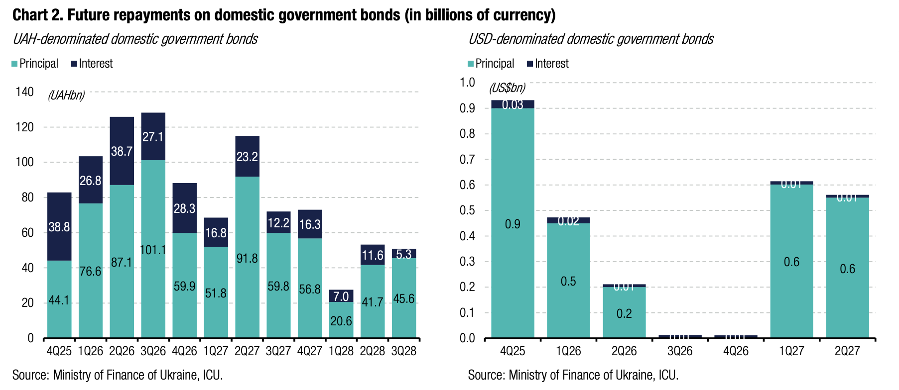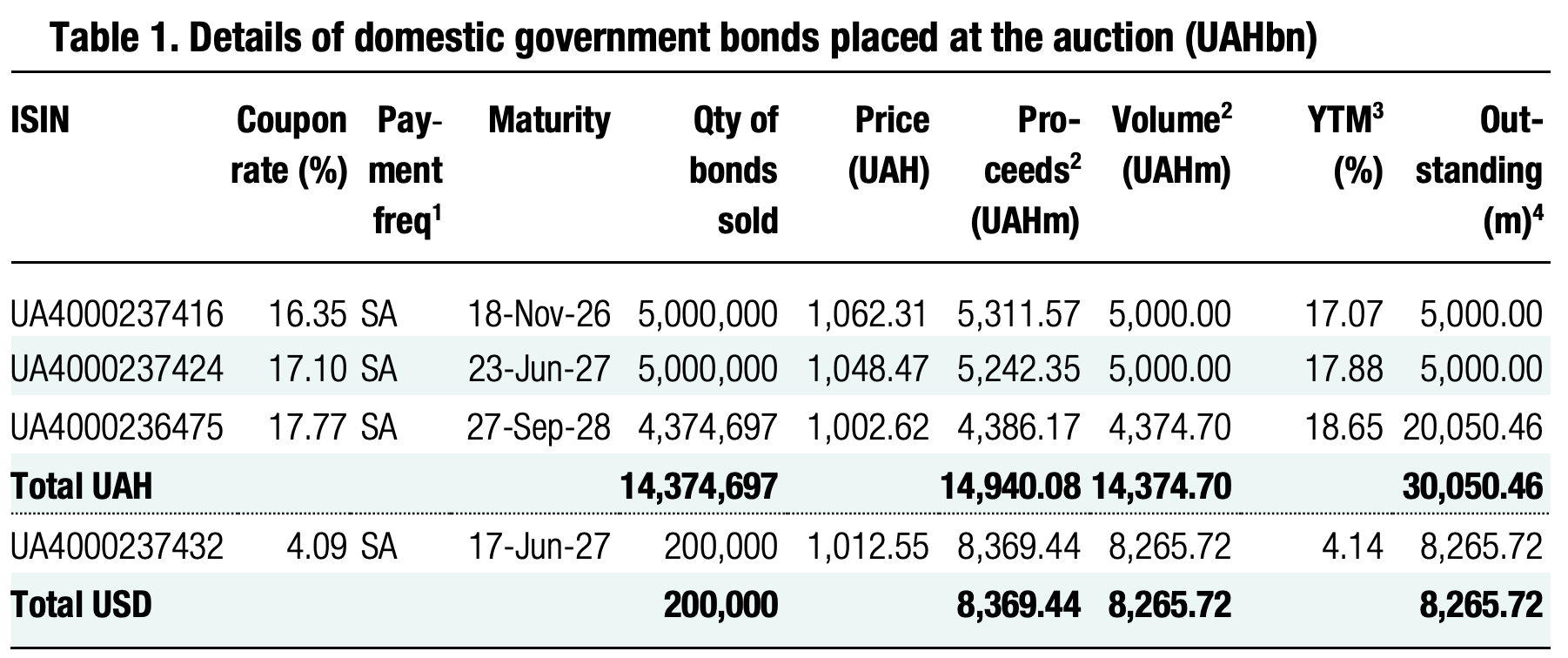 Note: [1] payment frequency abbreviations: M - monthly, Qtly - quarterly, SA - semi-annually, @Mty - at maturity date; [2] proceeds and volumes for the USD-denominated bonds are calculated based on the previous day's exchange rate 41.33/USD, 48.29/EUR; [3] yields on coupon-bearing bonds are effective yields to maturity. Sources: Ministry of Finance of Ukraine, Bloomberg, ICU