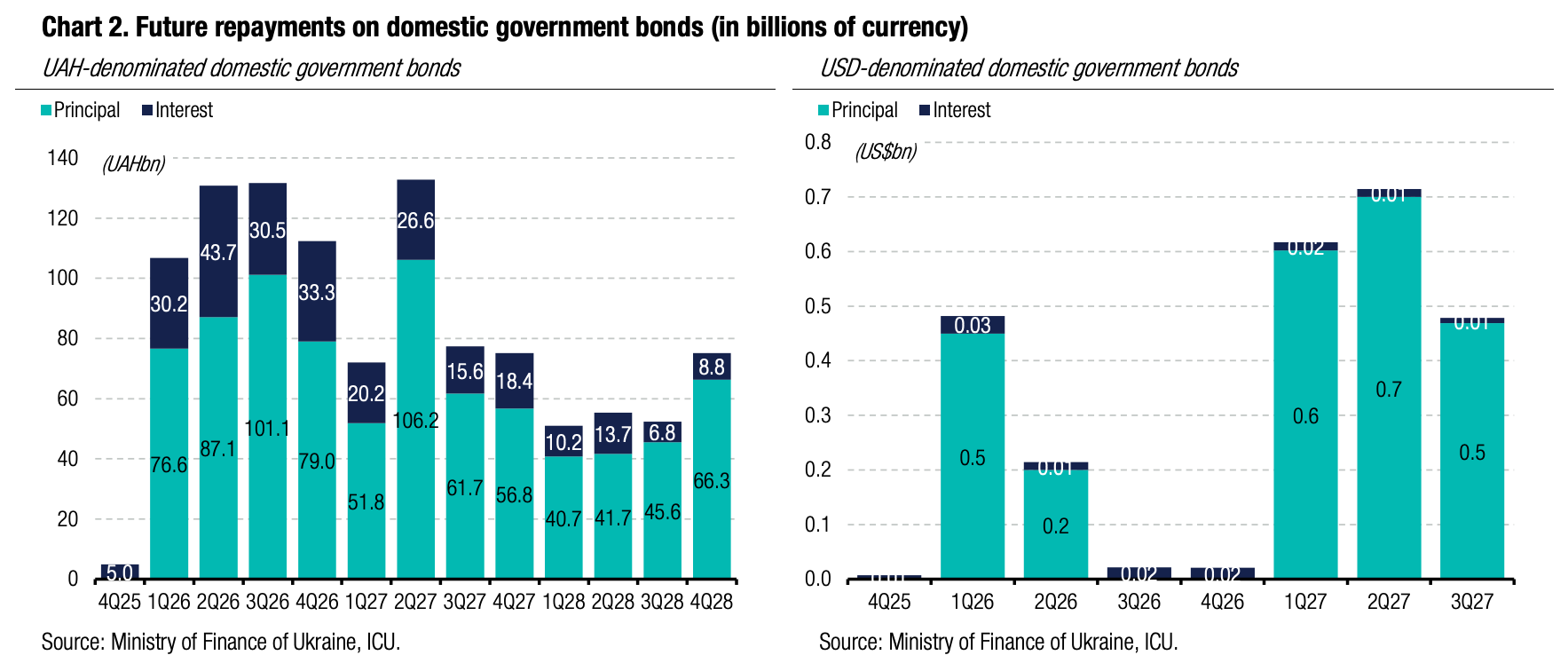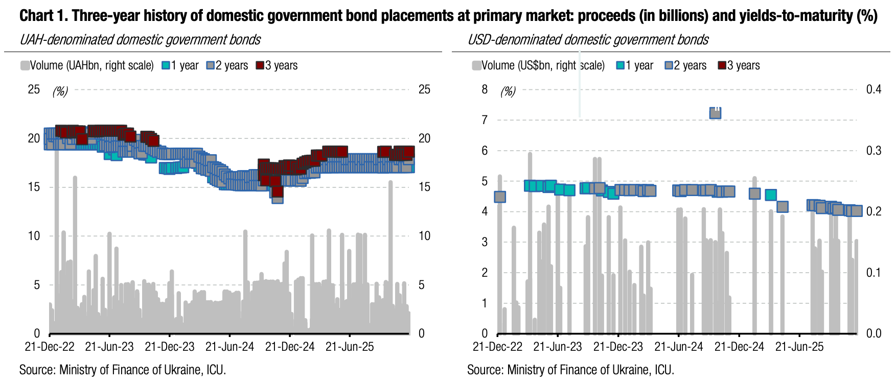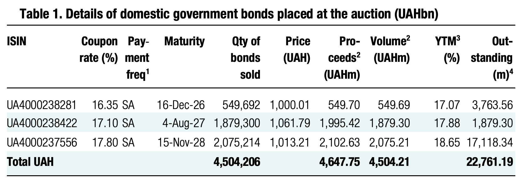 Note: [1] payment frequency abbreviations: M - monthly, Qtly - quarterly, SA - semi-annually, @Mty - at maturity date; [2] proceeds and volumes for the USD-denominated bonds are calculated based on the previous day's exchange rate 42.39/USD, 49.58/EUR; [3] yields on coupon-bearing bonds are effective yields to maturity. Sources: Ministry of Finance of Ukraine, Bloomberg, ICU.
