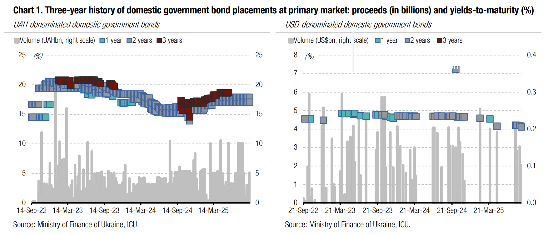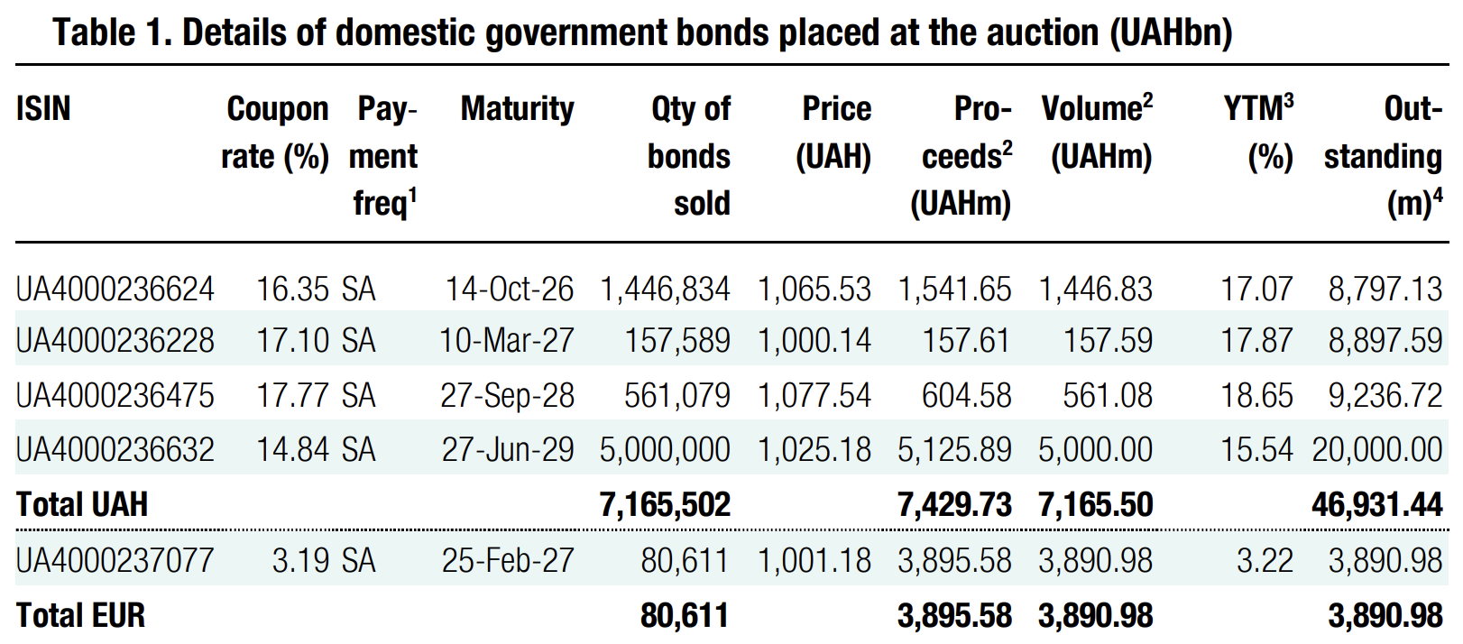 Note: [1] payment frequency abbreviations: M - monthly, Qtly - quarterly, SA - semi-annually, @Mty - at maturity date; [2] proceeds and volumes for the USD-denominated bonds are calculated based on the previous day's exchange rate 41.36/USD, 48.27/EUR; [3] yields on coupon-bearing bonds are effective yields to maturity. Sources: Ministry of Finance of Ukraine, Bloomberg, ICU.