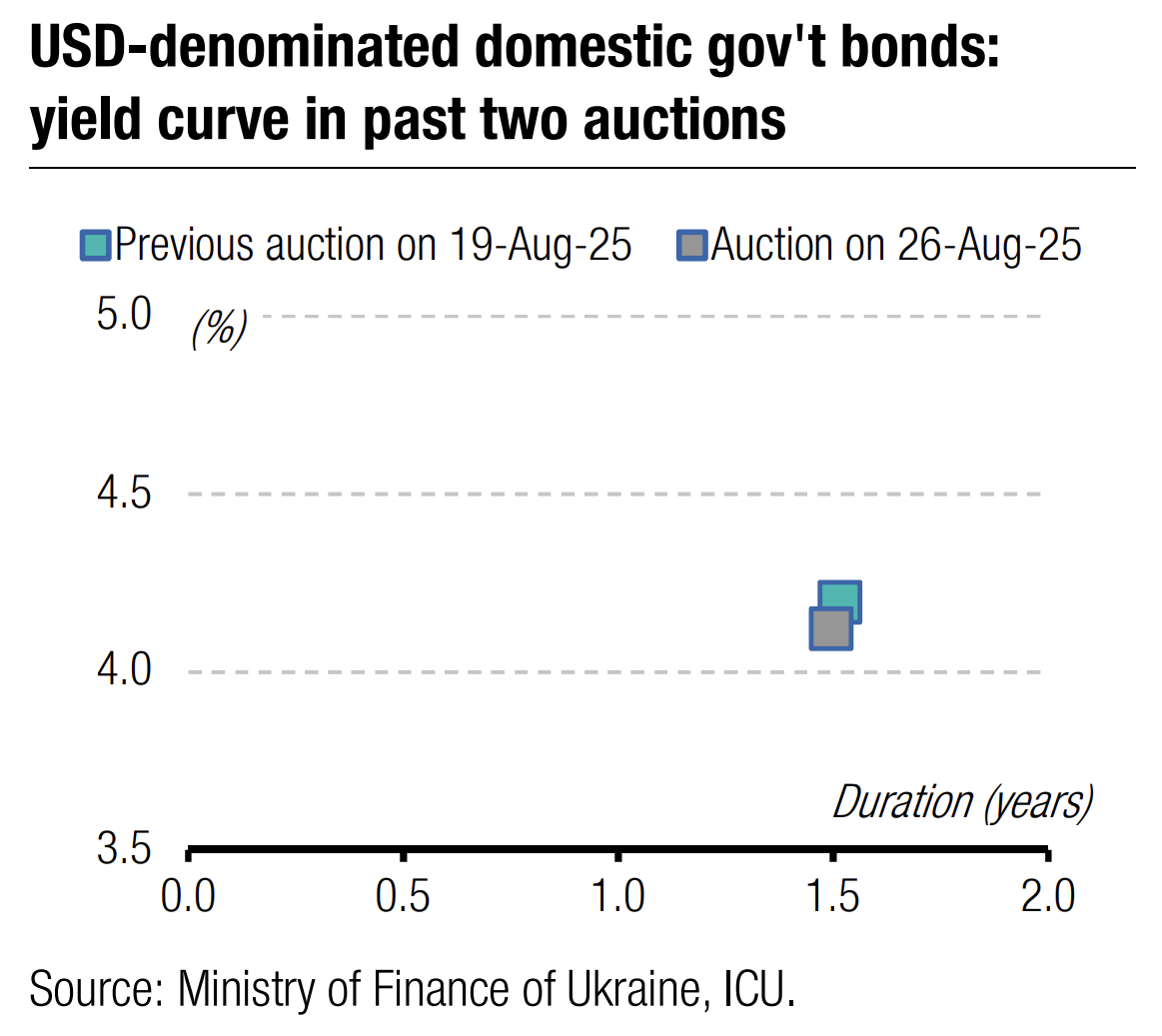 Most of the funds were raised from reserve bonds. The MoF sold another UAH5bn of bonds maturing in June 2029, which banks can use to cover part of their mandatory reserves. Demand exceeded supply by only 43%, and bid rates differed little from the previous placement in mid-August. Yesterday's cut-off rate did not change compared with the auction in August, and the weighted average slid by only 2bp.