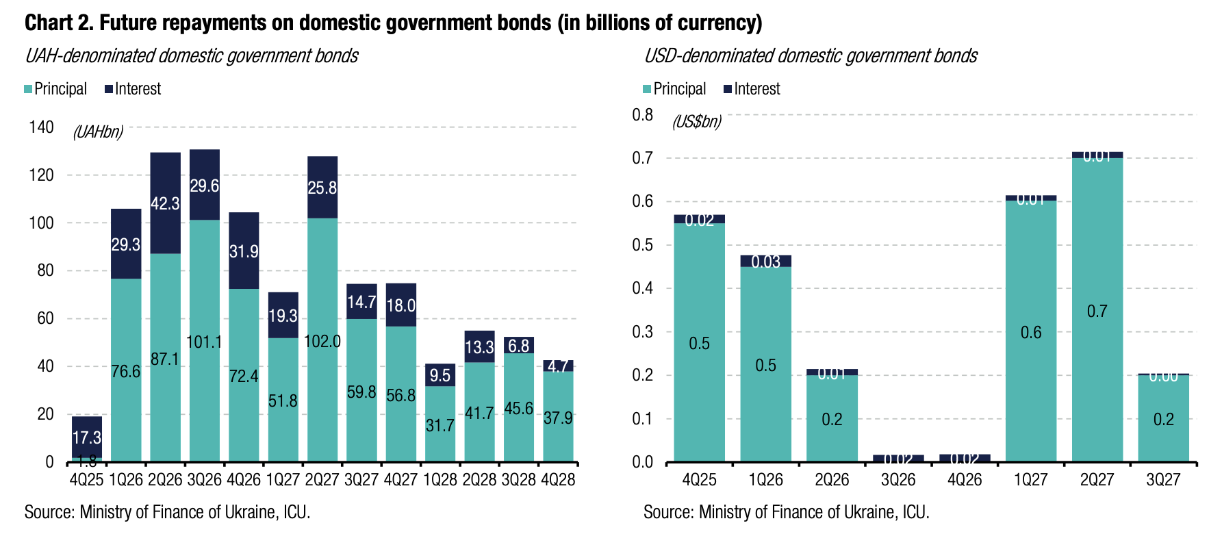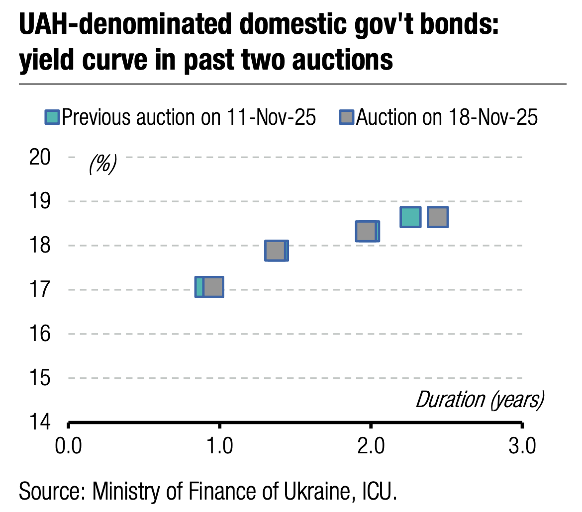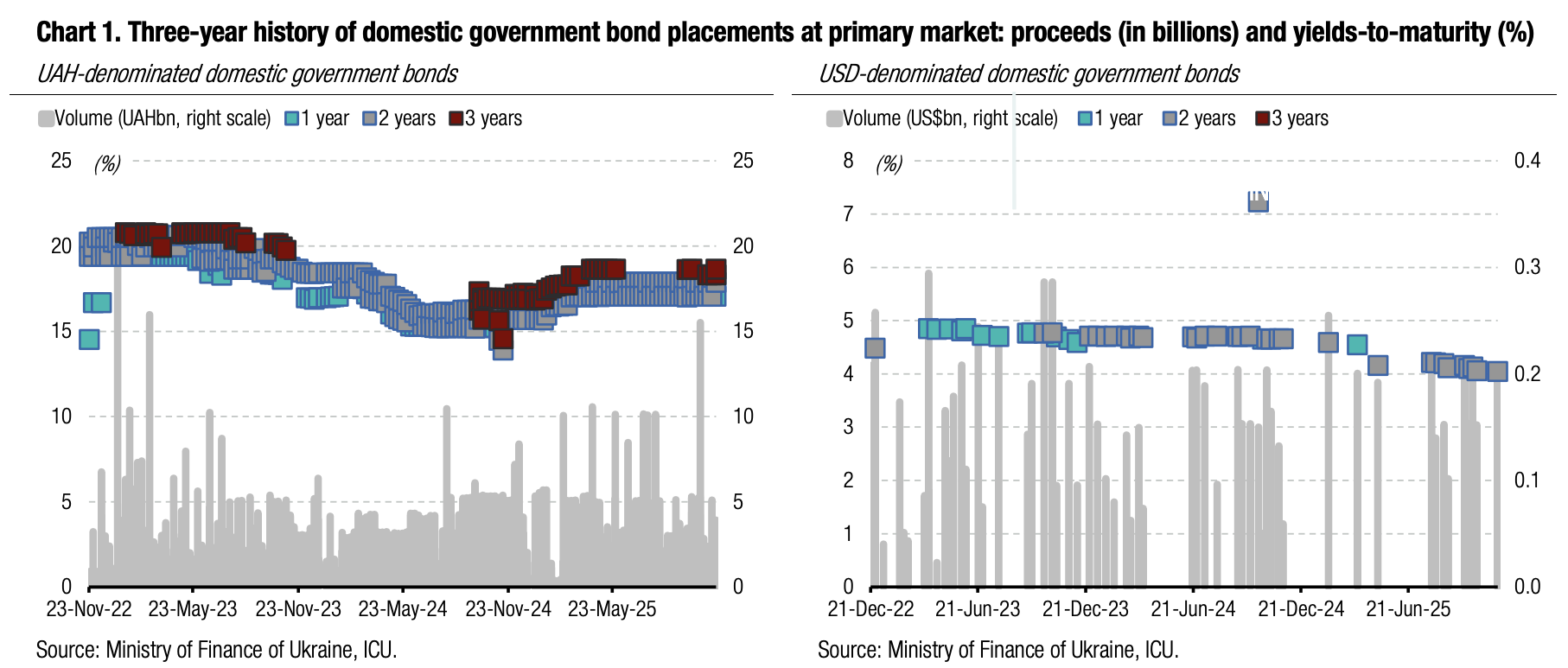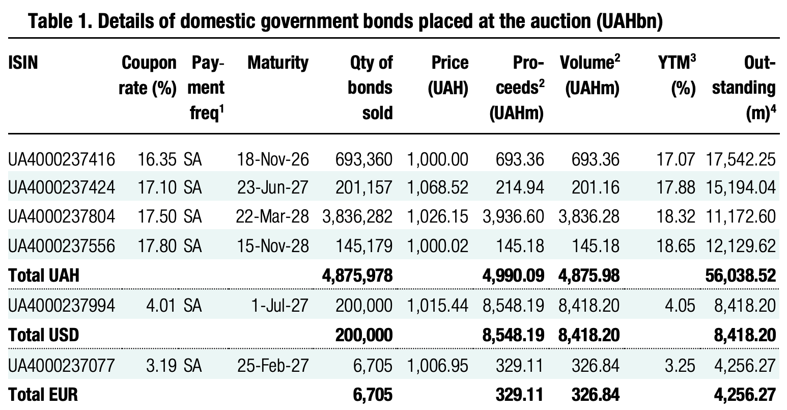 Interest in UAH bonds decreased again, as investors have shifted their focus to USD-denominated and EUR-denominated securities. Most proceeds for the budget were from USD-denominated bills and UAH military bonds maturing in 2028.