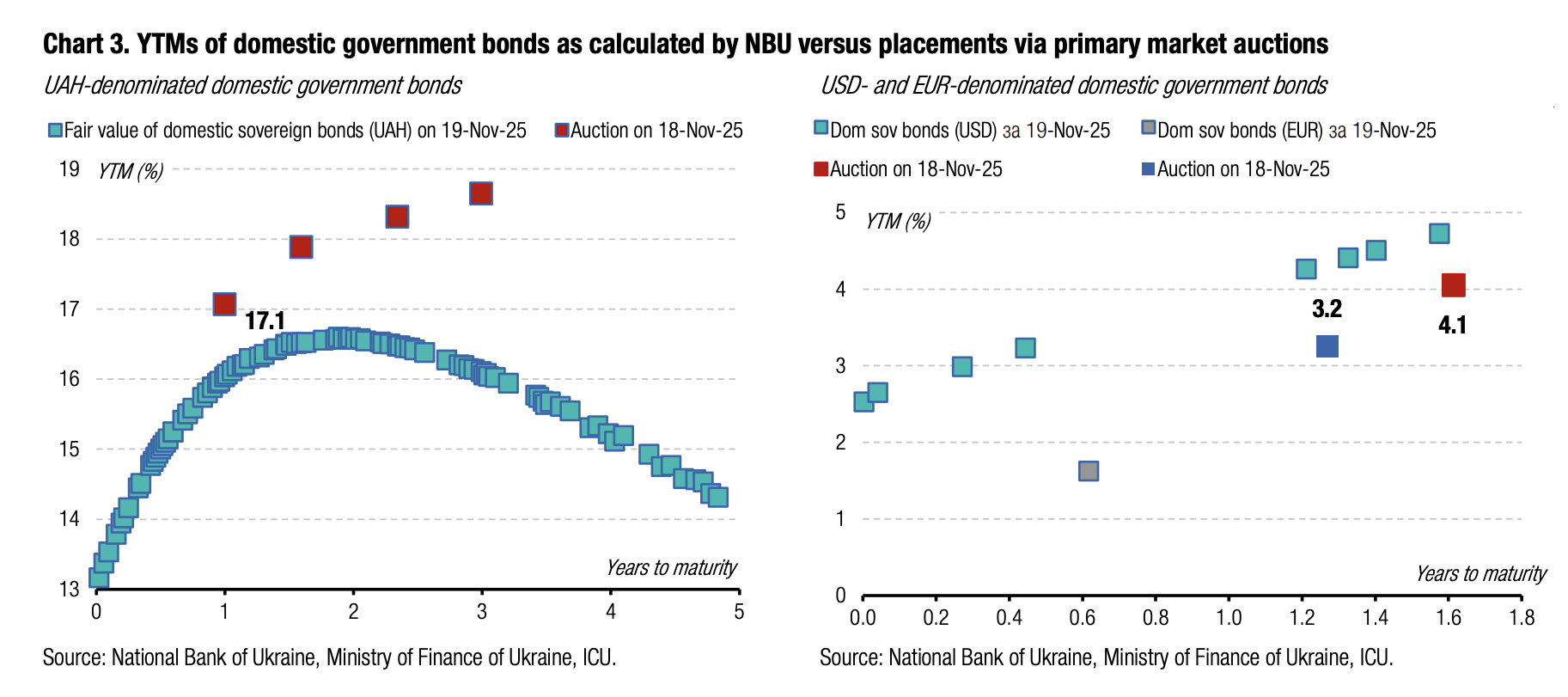 Note: [1] payment frequency abbreviations: M - monthly, Qtly - quarterly, SA - semi-annually, @Mty - at maturity date; [2] proceeds and volumes for the USD-denominated bonds are calculated based on the previous day's exchange rate 42.09/USD, 48.75/EUR; [3] yields on coupon-bearing bonds are effective yields to maturity. Sources: Ministry of Finance of Ukraine, Bloomberg, ICU.