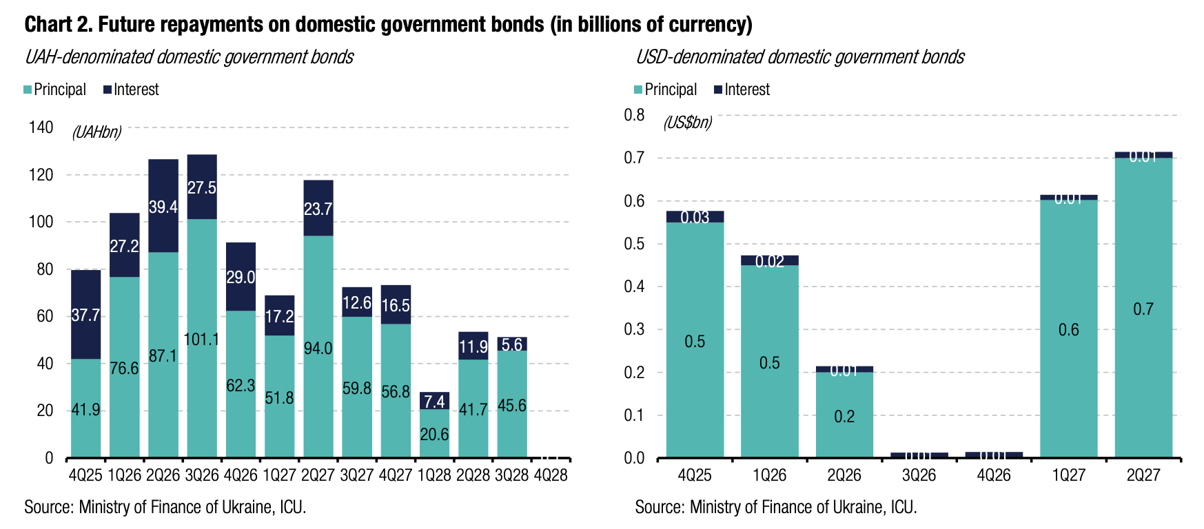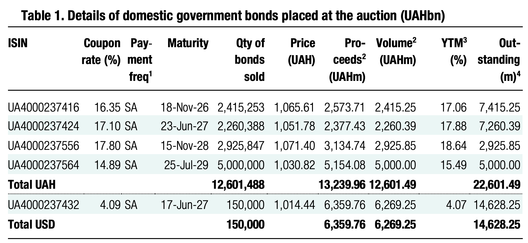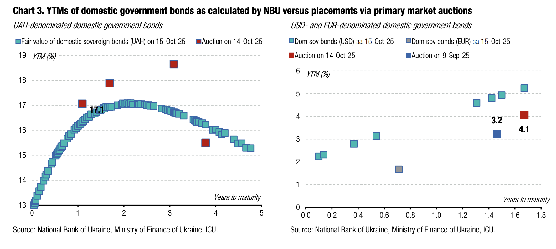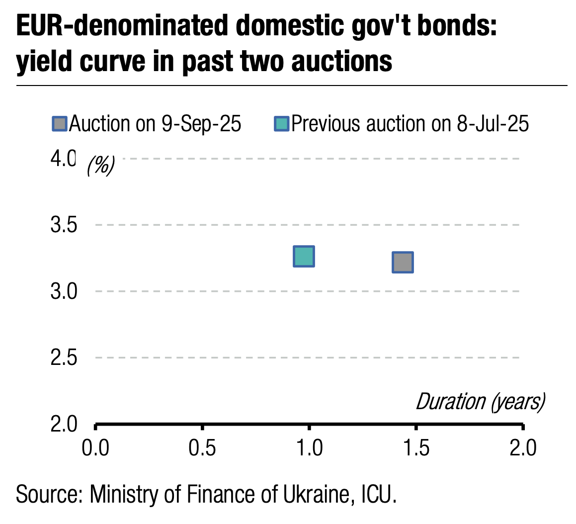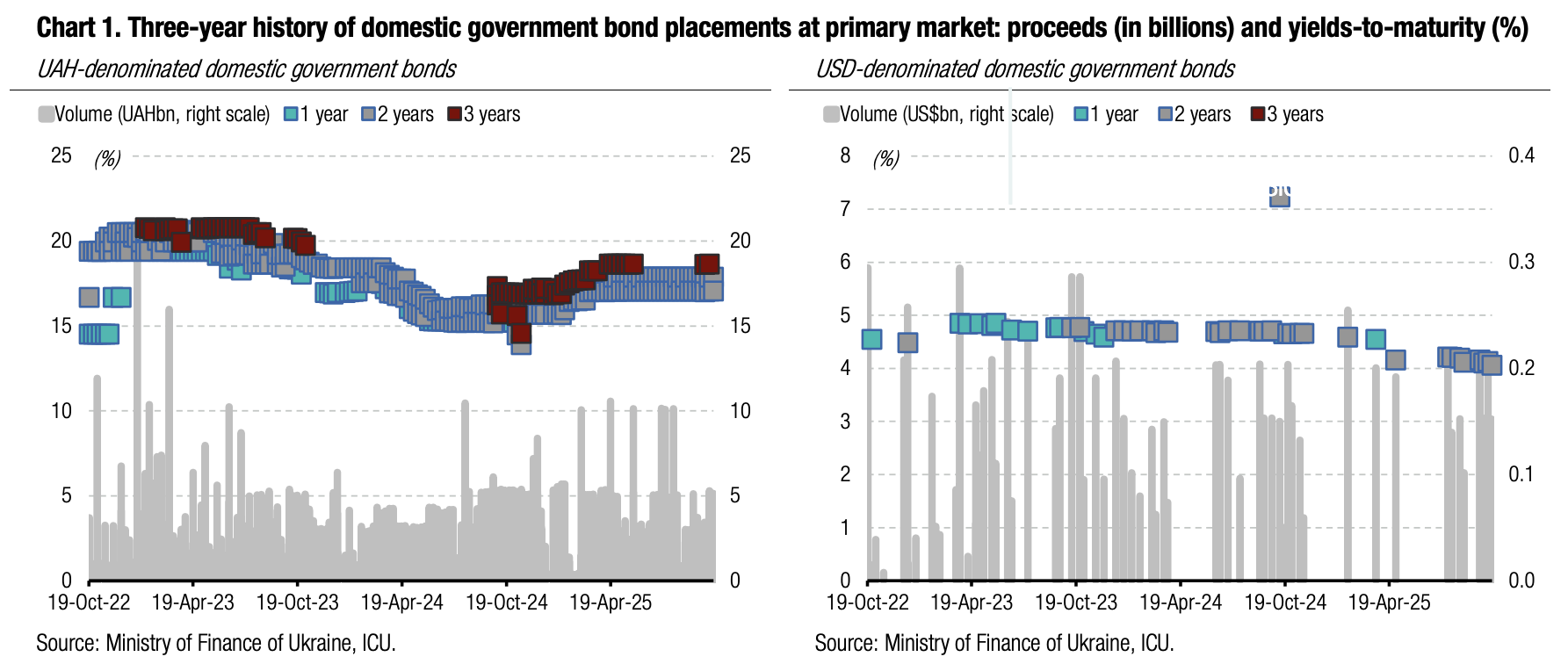 Note: [1] payment frequency abbreviations: M - monthly, Qtly - quarterly, SA - semi-annually, @Mty - at maturity date; [2] proceeds and volumes for the USD-denominated bonds are calculated based on the previous day's exchange rate 41.8/USD, 48.29/EUR; [3] yields on coupon-bearing bonds are effective yields to maturity. Sources: Ministry of Finance of Ukraine, Bloomberg, ICU.