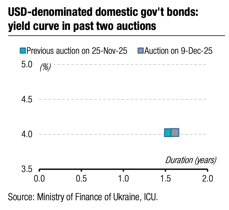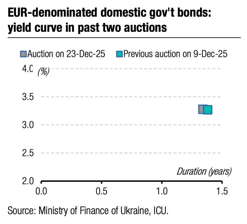 The shortest military bills received very restrained demand, at UAH2bn in 27 bids. The bid rates were typical, 16.3-16.35%, so the final yields were unchanged: a 16.35% cut-off rate and a 16.34% weighted-average yield.