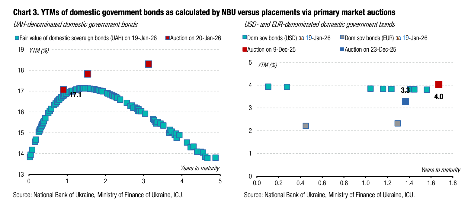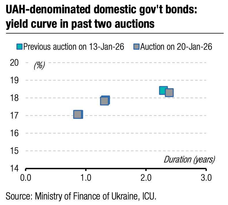 The MoF encouraged bidders to increase competition, especially for new securities, as expectations that the NBU will indeed lower the discount rate at the end of January are growing. At the same time, auction participants were very restrained in their attitude towards competition and allowed the Ministry of Finance to reduce the coupon rate by only 32bp.