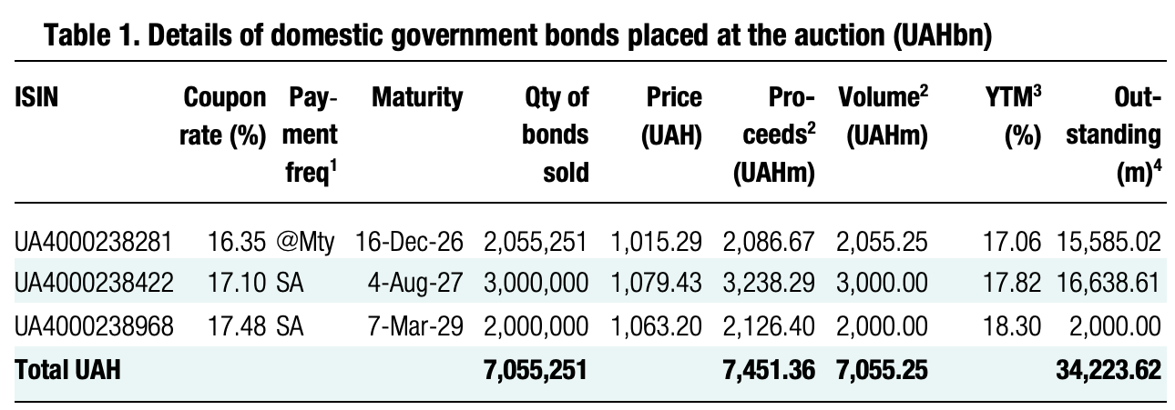 Note: [1] payment frequency abbreviations: M - monthly, Qtly - quarterly, SA - semi-annually, @Mty - at maturity date; [2] proceeds and volumes for the USD-denominated bonds are calculated based on the previous day's exchange rate 42.39/USD, 49.53/EUR; [3] yields on coupon-bearing bonds are effective yields to maturity. Sources: Ministry of Finance of Ukraine, Bloomberg, ICU.