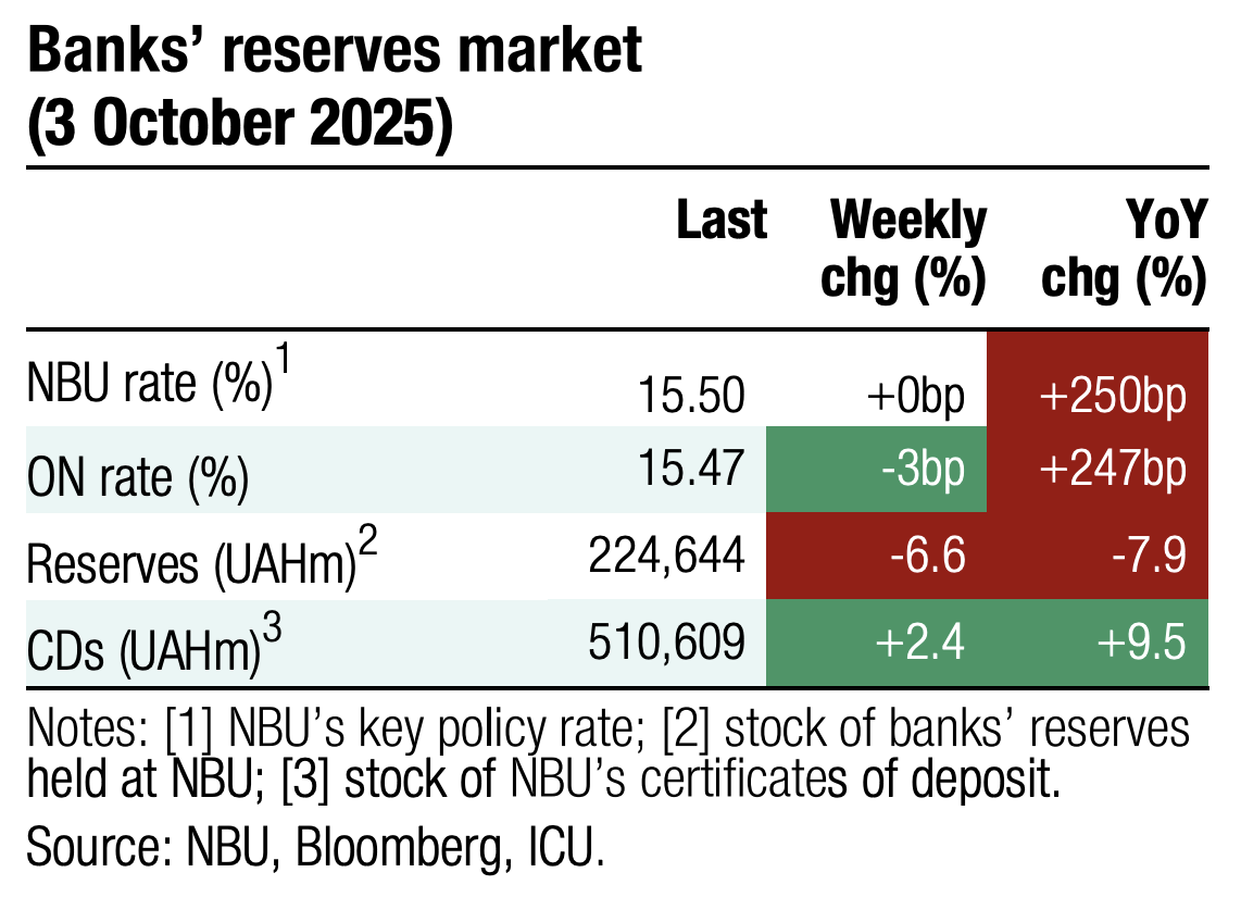 ICU view: At the end of September, exporters had to sell more foreign currency to pay VAT and excise taxes in UAH. This was likely the main reason for a decline in FX market imbalances last week. Yet, we believe this is a temporary improvement, and we expect interventions will soon return to a US$500-600m range per week, i.e. close to the average during a full-scale war.