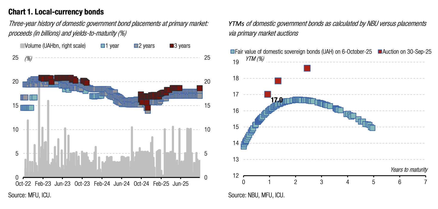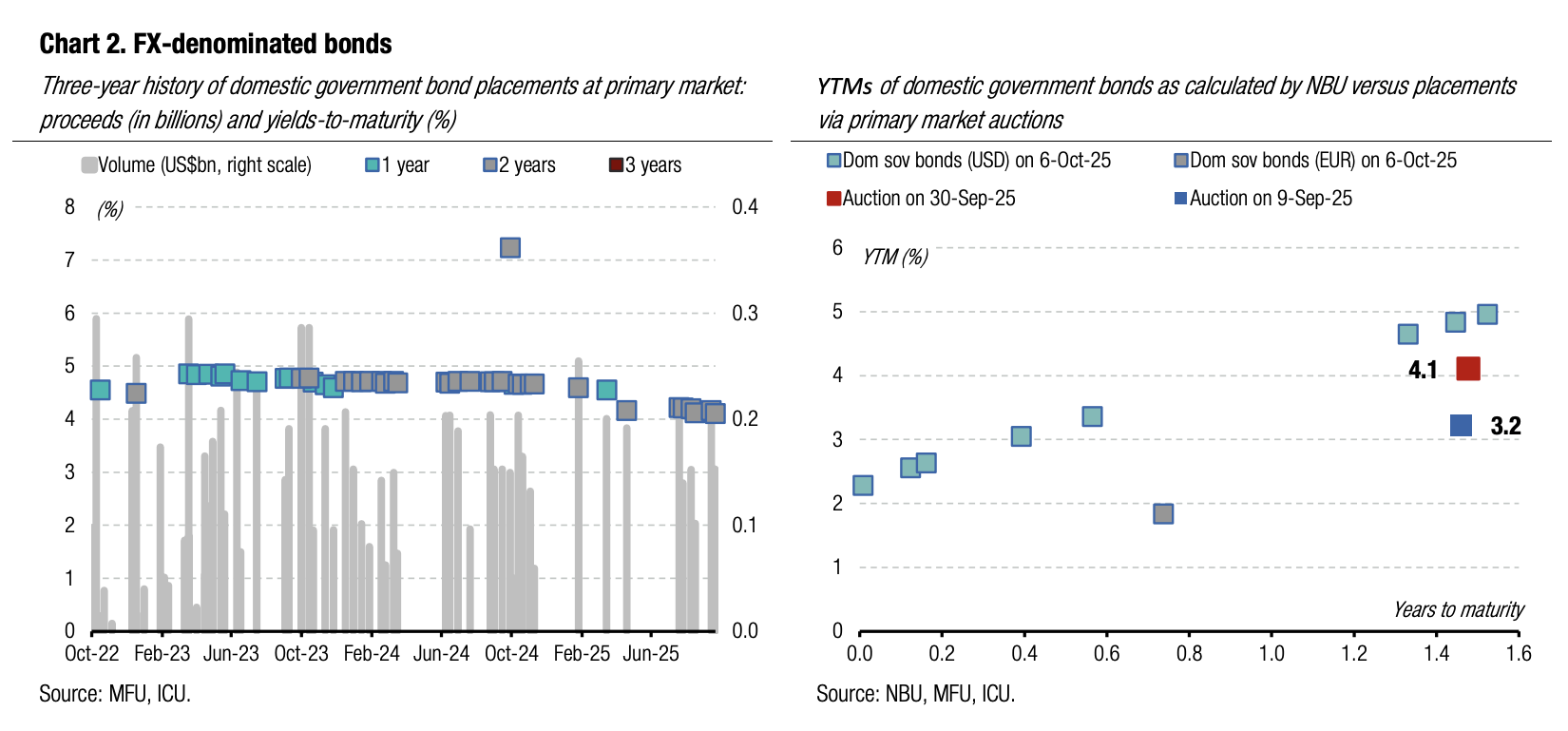 During September, the MoF sold UAH51bn worth of bonds in all currencies, which improved the rollover rate by several percentage points compared with 8M25. During 9M25, the rollover of UAH debt rose by 4pp to 117%, for USD debt it was up by the same 4pp to 80%, while for debt in euros, it inched up by only 1pp to 85%. Domestic debt refinancing in all currencies improved by 4pp to 106%. In September, the MoF refinanced 100% of redeemed USD-denominated paper for the first time this year.