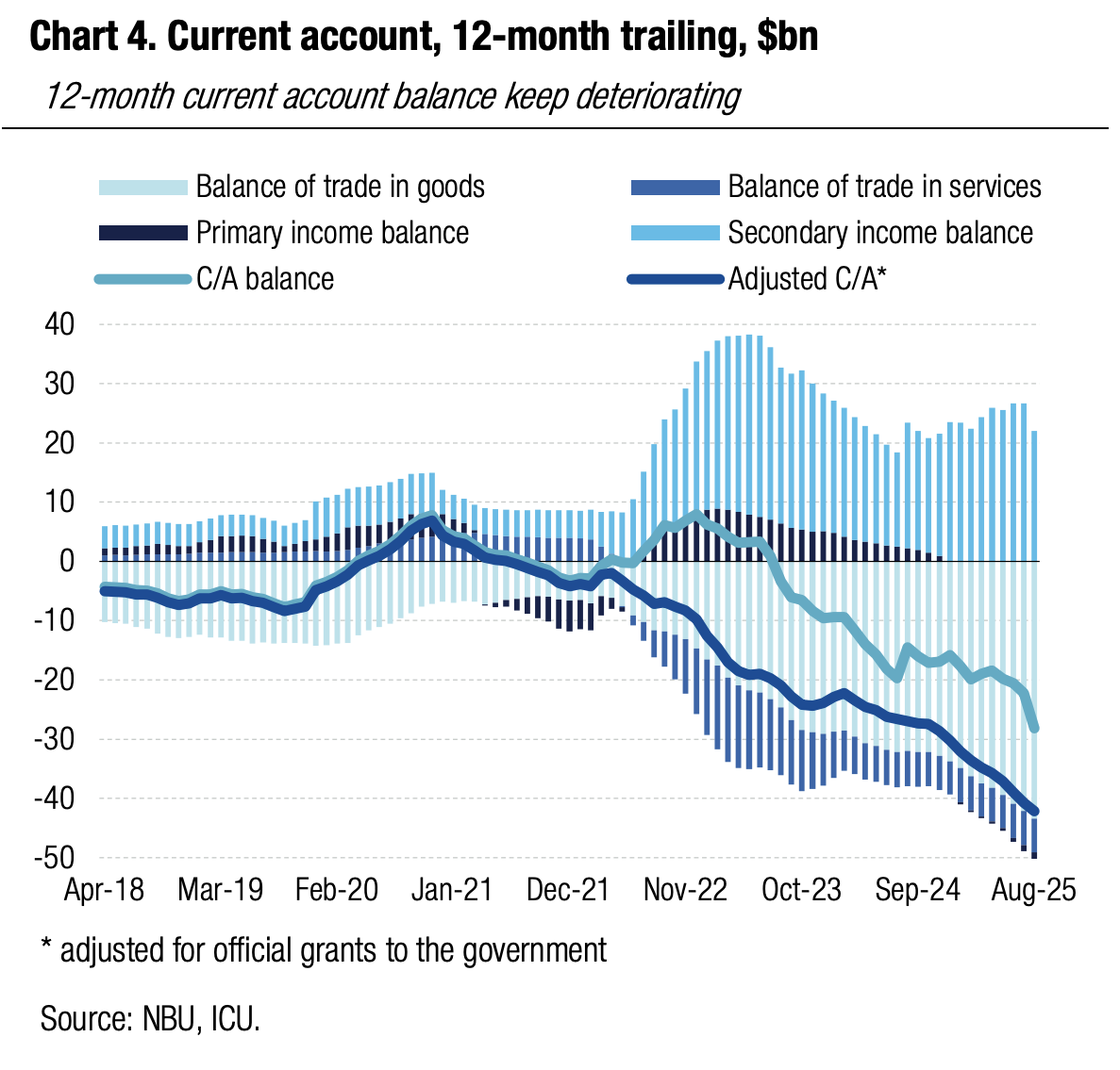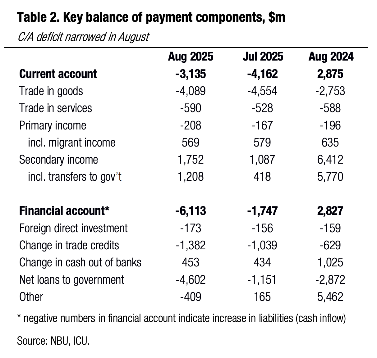 The trade-of-goods deficit saw an improvement on a decline in imports vs July, but still remained large at US$4.1bn taking the 8M25 result to US$30.4bn from US$20.2bn in 8M24. August export of goods was lackluster as it declined 9% YoY (-4% in 8M25) on sluggish sales of agricultural products. Imports continued to grow at a double-digit pace (+17.5% YoY in August and +19.8% in 8M25). The deficit of trade in services and the deficit of primary income remained little changed vs. both July and August 2024. Secondary income surplus was the key factor that drove the improvement in C/A balance in August vs. July on larger foreign budgetary transfers to the Ukrainian government.