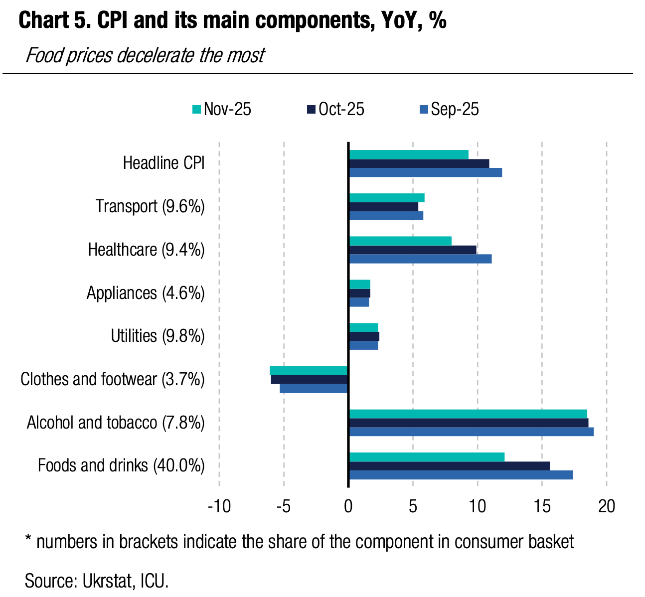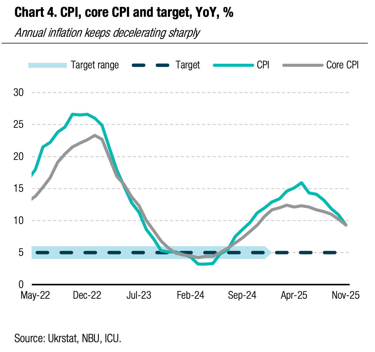 The NBU Board left the key policy rate at 15.5% on December 11, in line with expectations signalled at the previous meeting. The decision reflects heightened concern over securing international financial support rather than domestic inflation dynamics. November inflation declined to 9.3% YoY for both headline and core measures, considerably below the NBU October forecast trajectory. The slowdown in inflation was driven primarily by seasonal food supply increases from new harvests. However, inflation expectations remain elevated, with web-search data indicating continued household attention to price pressures.