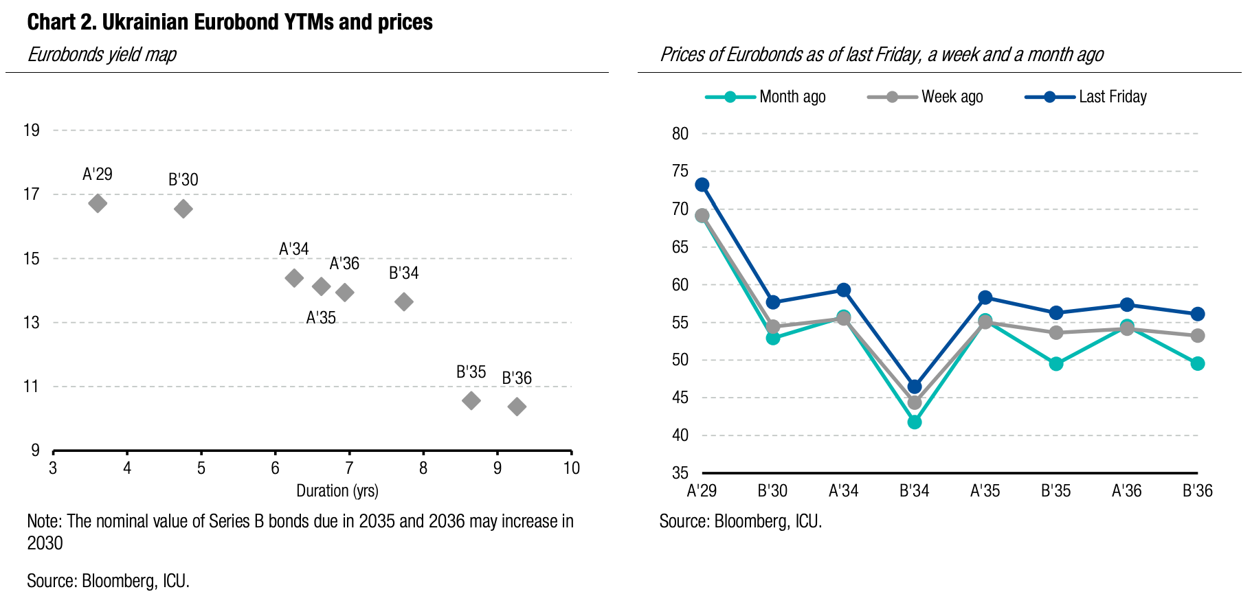 ICU view: The current wave of investor optimism is quite strong. The US President and his team continue to engage with European and Ukrainian representatives, but the rhetoric of russian officials currently suggests that russia will avoid a settlement at all cost, at least in the coming couple of months. Prices of Ukrainian Eurobonds rose again last week, while VRIs' quotes stayed above their notional value for the second week.