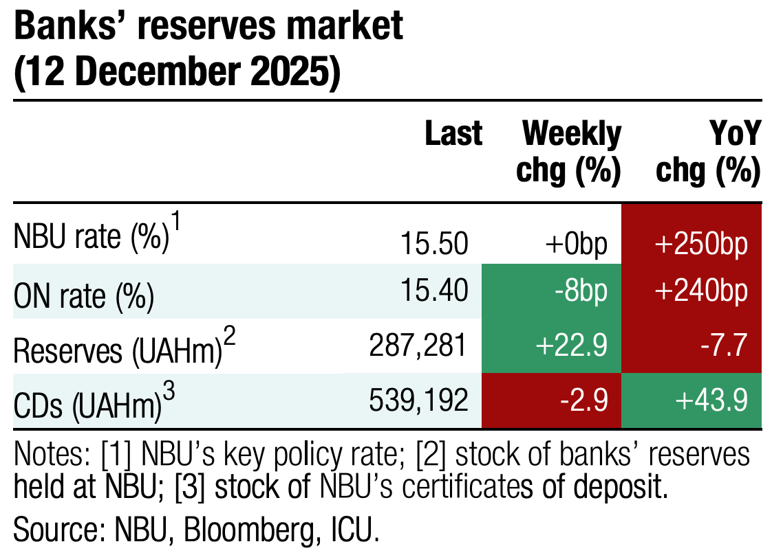 ICU view: The National Bank is concerned about the prospects of international financial support next year, since there is still no final decision on the reparations loan. The NBU's further policy will depend on the EU's decisions, which we expect to be positive. Therefore, we anticipate the NBU will continue to stick by a conservative currency policy, allowing only a moderate weakening of the hryvnia throughout 2026. Given risks to external funding, the NBU decided to keep the key policy rate unchanged this time, again to ensure that yields on hryvnia assets are attractive enough and that pressures on the FX market do not build.