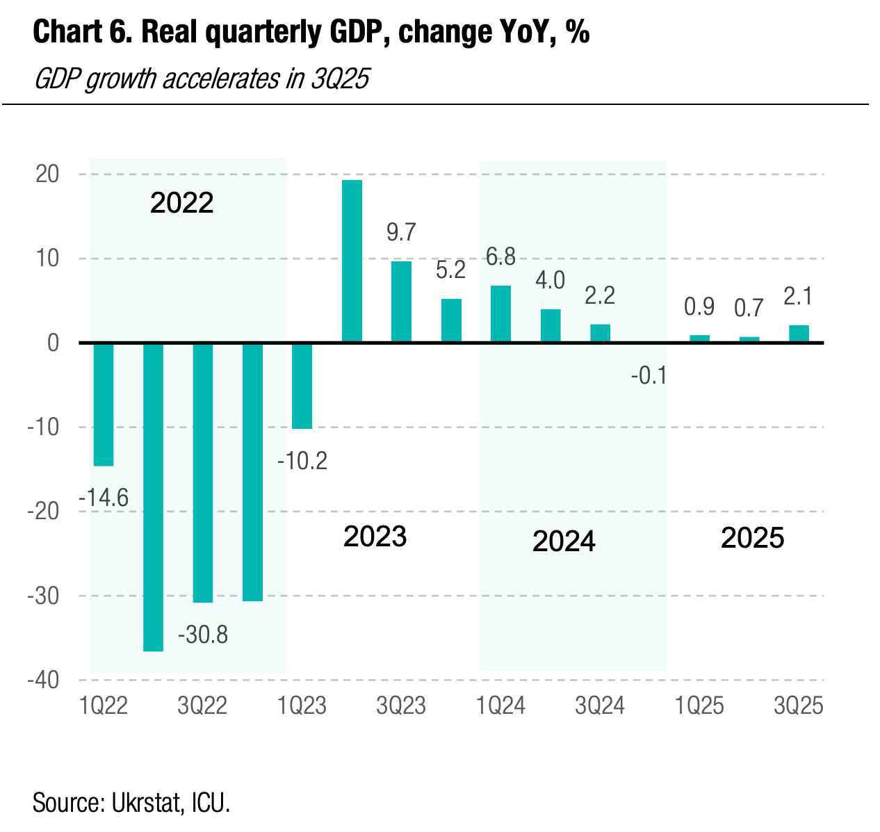 Ukraine’s GDP accelerated to 2.1% YoY in 3Q25, implying it was at 79% of the pre-invasion (2021) level.