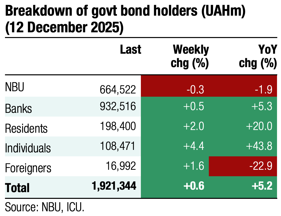ICU view: Retail investors continue to invest their savings in local government debt, and they increasingly prefer UAH instruments. Their preference for local currency is supported by both the high yields of UAH bonds and the MoF's policy to gradually reduce the stock of outstanding FX-denominated bonds. The NBU has kept the key policy rate at 15.5% for the tenth consecutive month while keeping the UAH/US$ rate relatively flat, therefore, hryvnia assets are set to remain attractive at least in the near future.