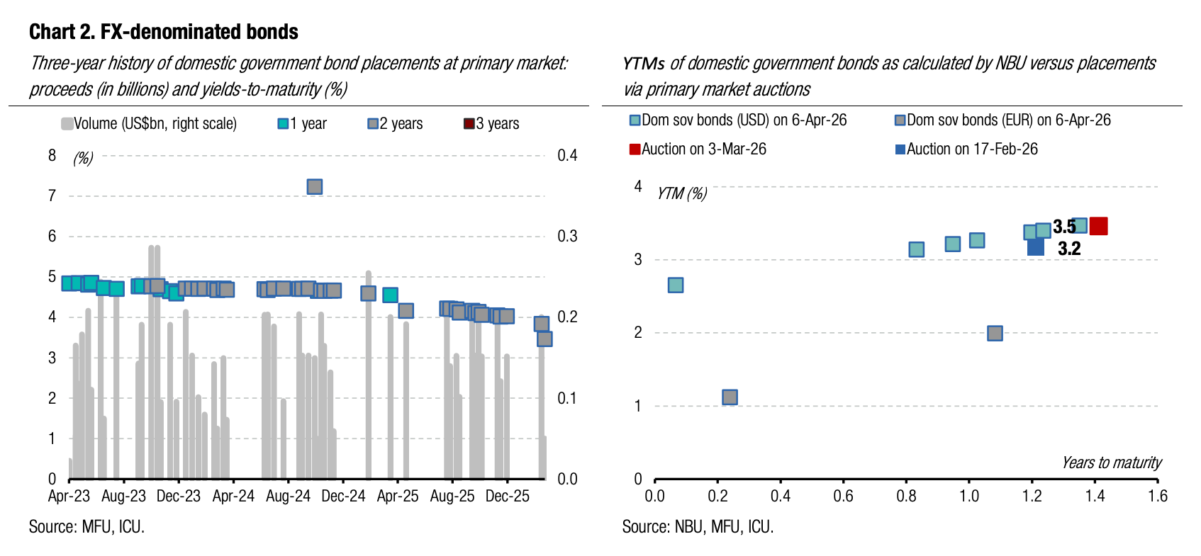 Overall, the domestic debt rollover was 139% in 1Q26, little changed from 2M26. The rollover rate was 152% for hryvnia debt (162% in 2M26), 55% for US dollar debt (44% in 2M26), while for debt in euros, all EUR91m are net borrowing.