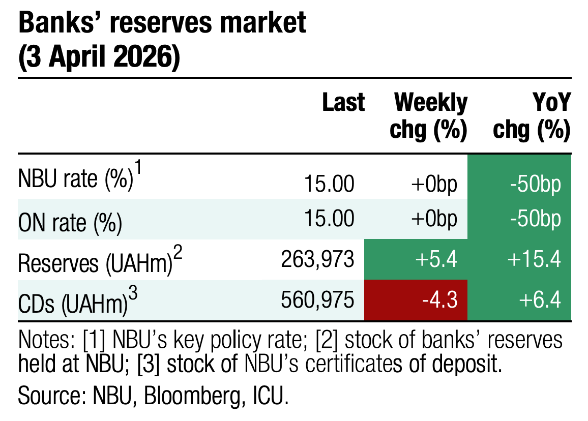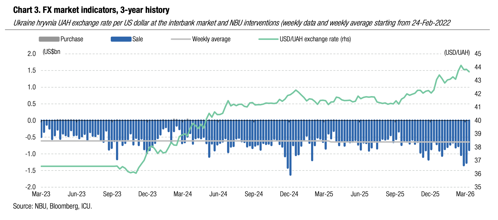 The National Bank continued to sell foreign currency actively last week, but total interventions were cut significantly to US$888m. That is close to the average weekly volume of interventions YTD and a third less than this year's maximum in mid-March. In total, in 1Q26, the NBU's net sale interventions reached US$11.5bn, which is US$2.1bn or 22% more than in 1Q25, when the NBU sold an average of US$750m per week.