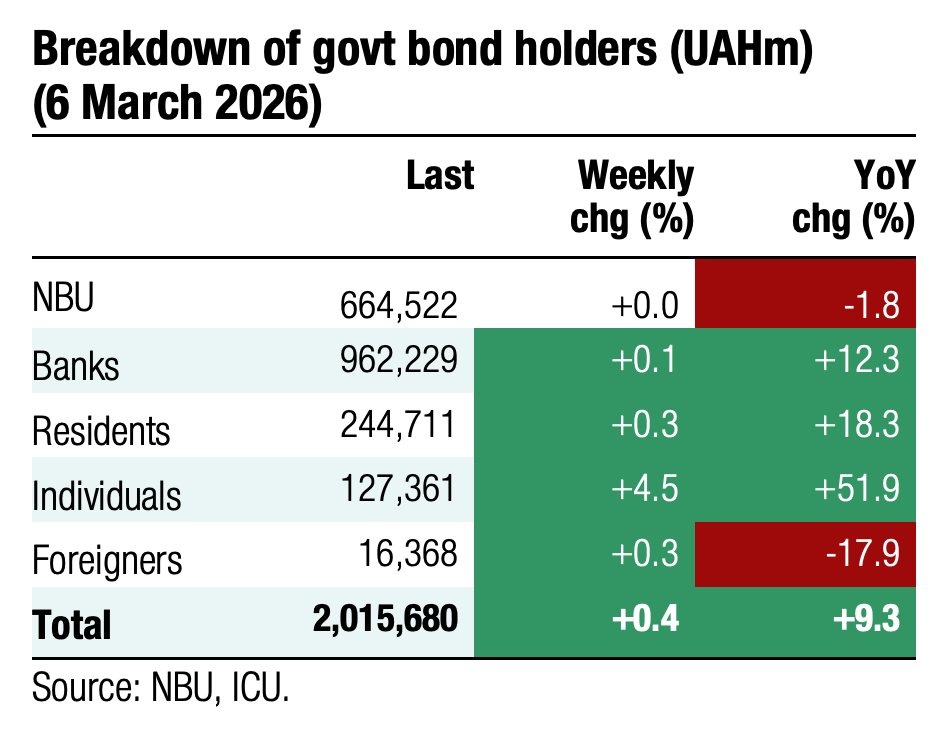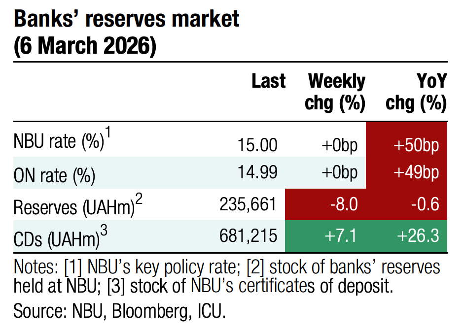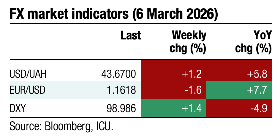 The lack of progress in the peace talks, once again, is yet another sign that the market tends to take signals from the trilateral meetings of the US, Ukraine, and russia in an overly optimistic manner. Ukraine Eurobond prices began to decline in mid-February. With the outbreak of war in Iran, sentiment towards emerging market debt markets worsened notably – the EMBI index fell by 1.6% last week. Global sentiment has only exacerbated the decline in Ukrainian bond prices by over 5% over the past three weeks.
