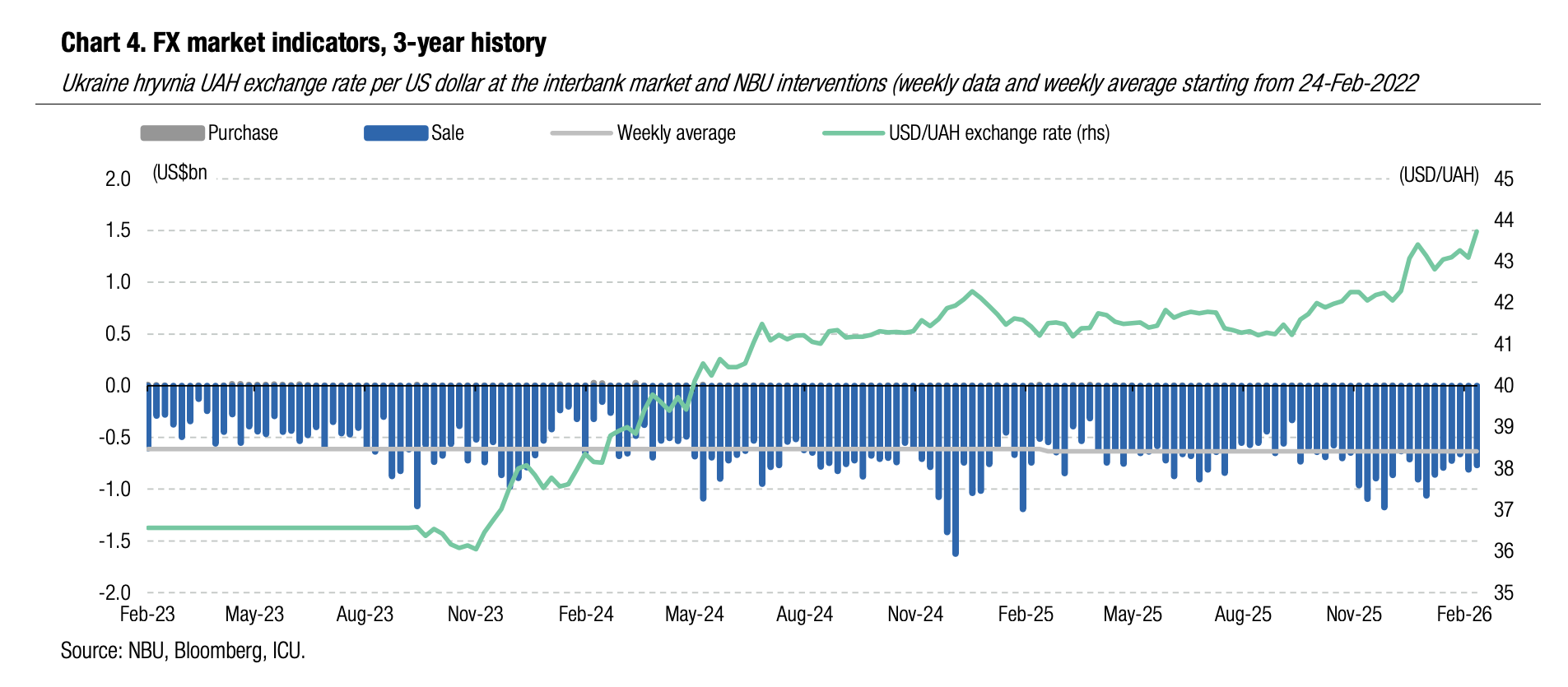 ICU view: The NBU’s decision to sharply weaken the hryvnia last week can hardly be explained purely by market factors, as neither the market deficit nor NBU interventions changed noticeably from the previous week. Therefore, the devaluation of the hryvnia should be interpreted as an NBU decision to take yet another step towards managed devaluation. To prevent strengthening depreciation expectations among local businesses and households, the NBU will likely seek to strengthen the hryvnia somewhat in the coming weeks. However, we expect the NBU will take another steps to weaken the hryvnia in the coming months so that the rate moves towards UAH45/US$ by end-2026.