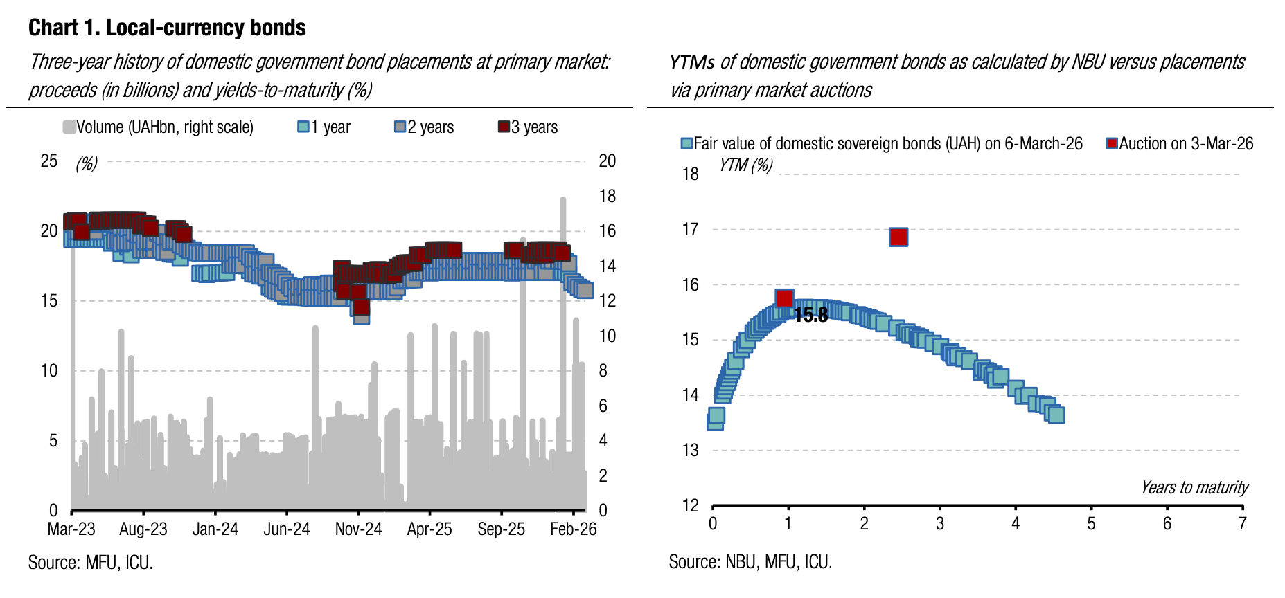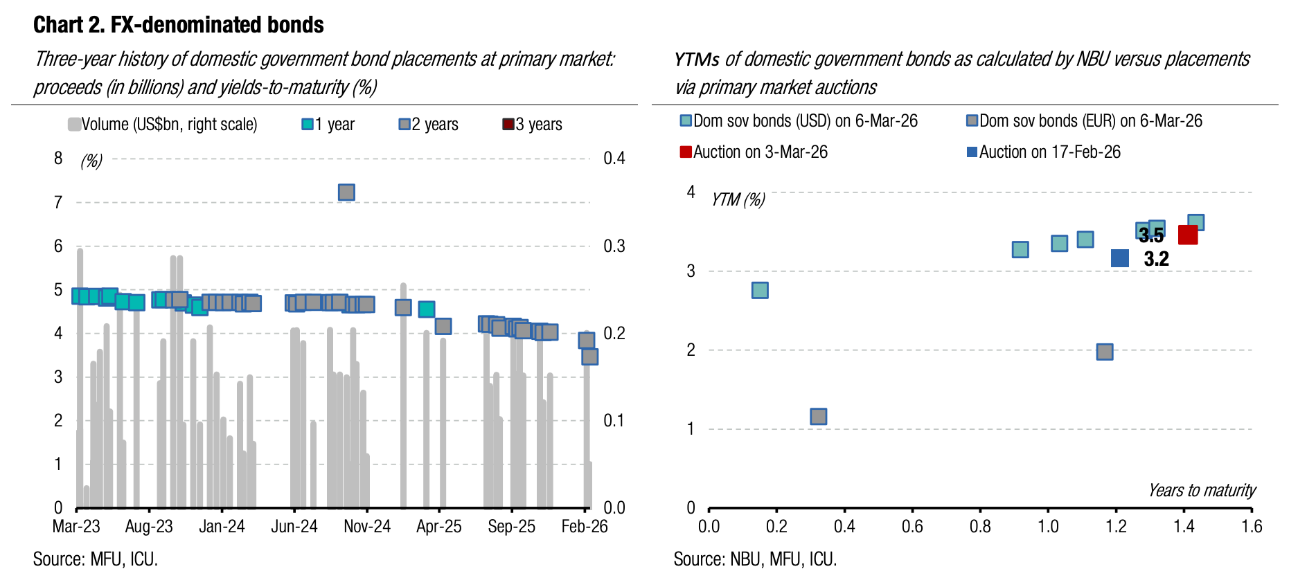 ICU view: The MoF currently has very limited room for further yield cuts in the primary market until the NBU makes another step to cut the key policy rate. The NBU key rate is currently 15%, and the yields on one-year bills in the primary market are 15.1%-15.19%. Therefore, the Ministry of Finance may face challenges if it tries to push the rate lower without the NBU revisiting its forecasts of the key rate trajectory. However, for longer-term securities, the MoF may maintain its efforts to reduce the term premium from the current 50bp for each additional year of maturity to approximately 40bp.