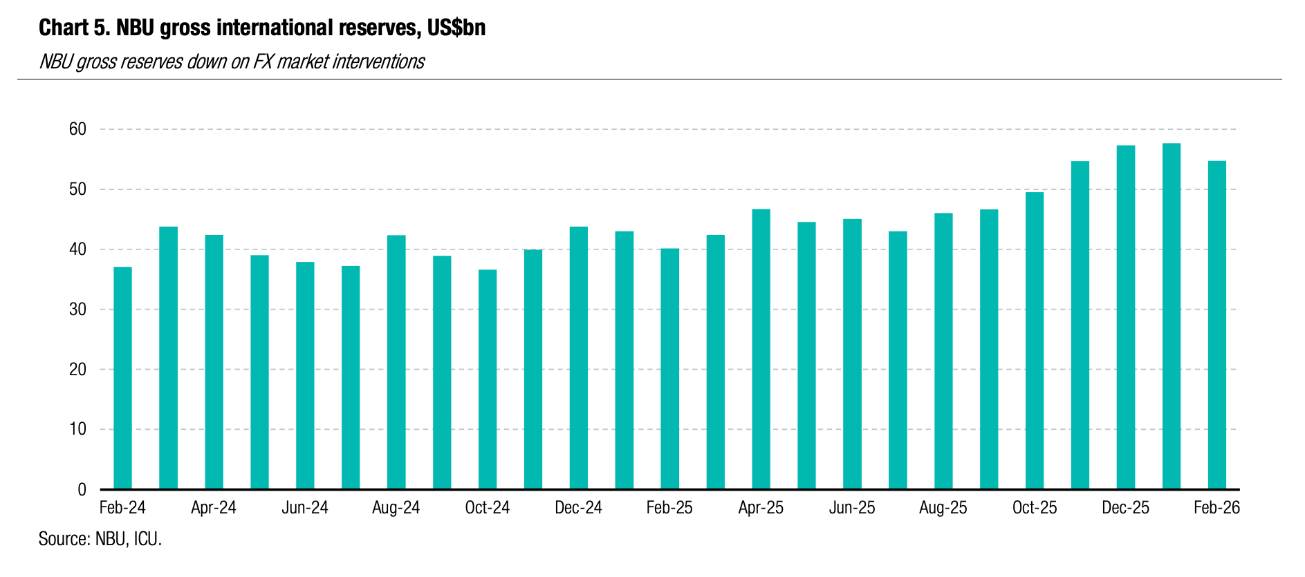 The gross international reserves of the NBU decreased 5% in February to US$54.8bn, an equivalent of 5.7 months of future import as per NBU estimates.
