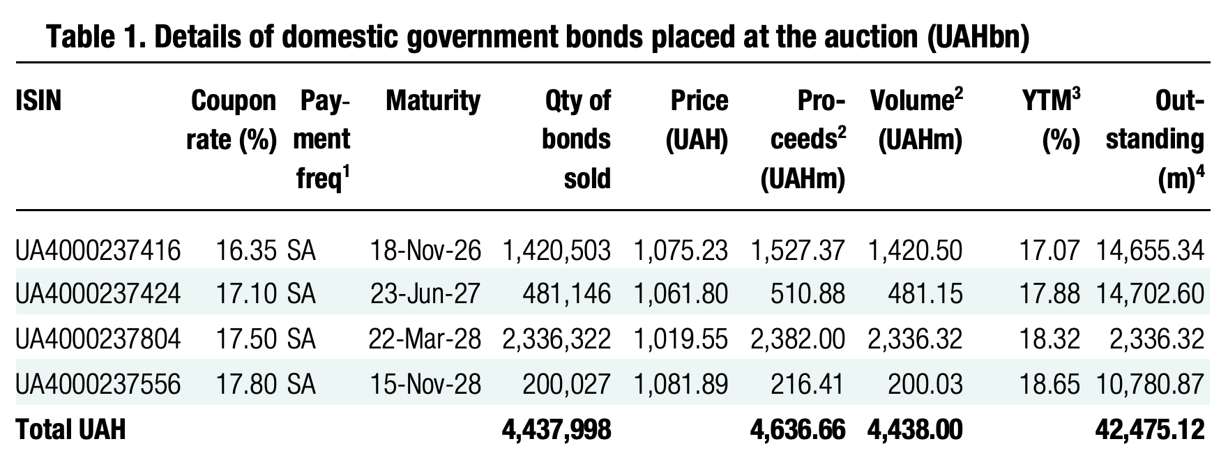 Additionally, the cut-off rate is 55bp higher than the yield on similar paper placed at the end of February or about half of the NBU's key policy rate increase in March.