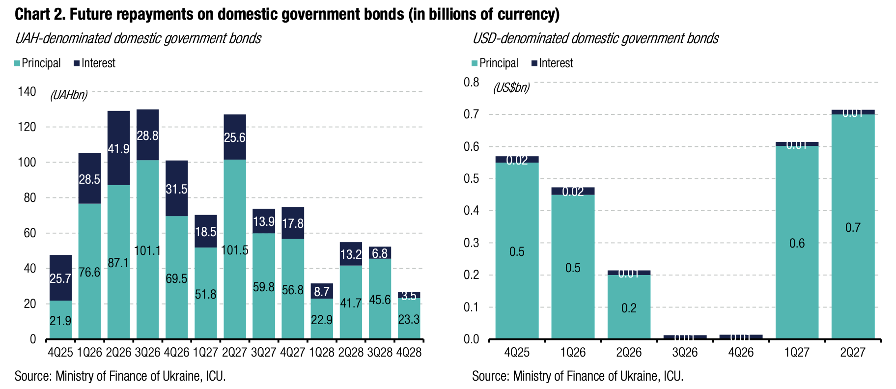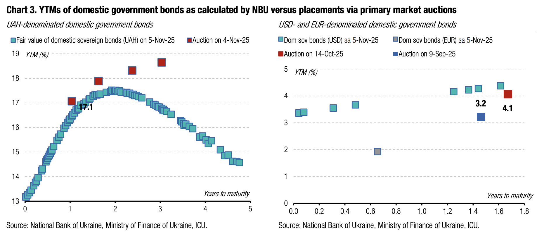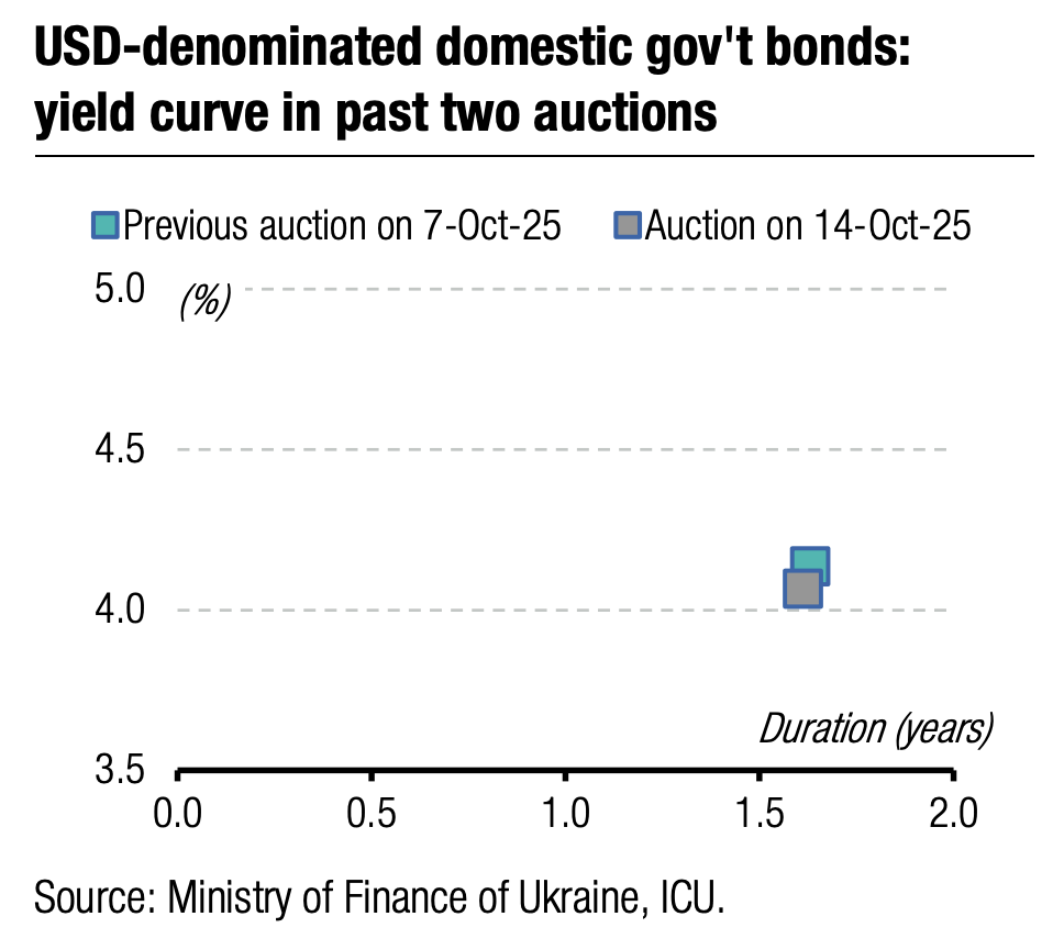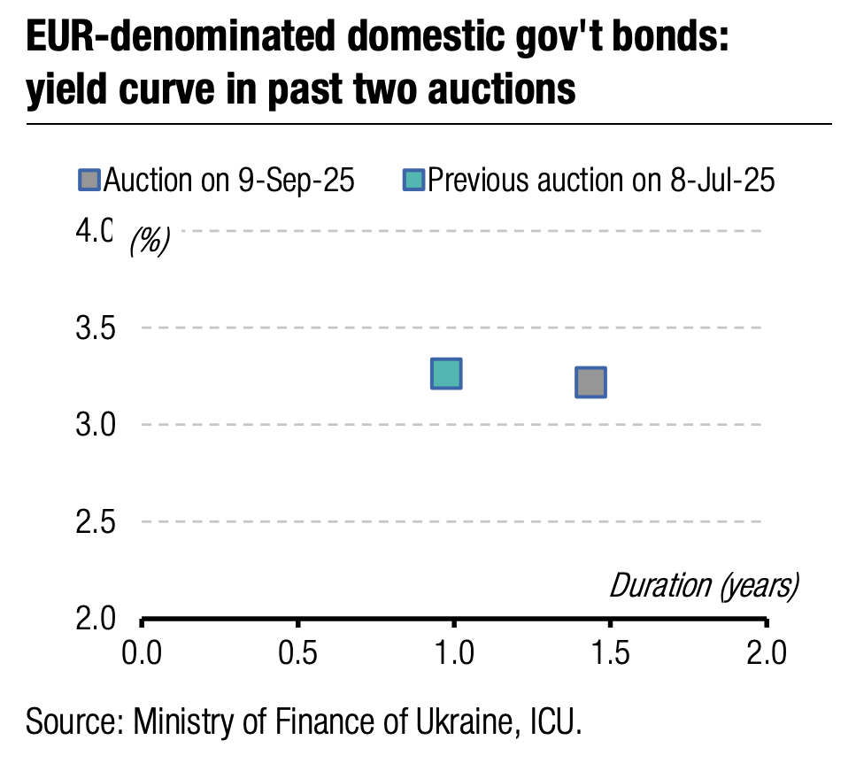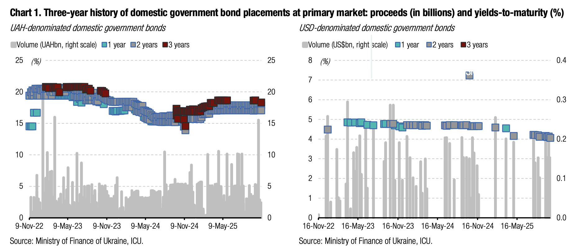 Note: [1] payment frequency abbreviations: M - monthly, Qtly - quarterly, SA - semi-annually, @Mty - at maturity date; [2] proceeds and volumes for the USD-denominated bonds are calculated based on the previous day's exchange rate 41.66/USD, 48.29/EUR; [3] yields on coupon-bearing bonds are effective yields to maturity. Sources: Ministry of Finance of Ukraine, Bloomberg, ICU.