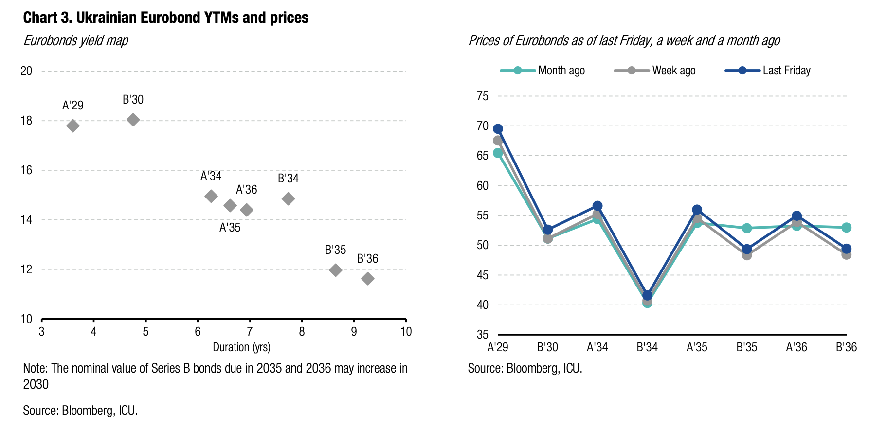 ICU view: Continued military support from the US through NATO and the preparation of a massive new EU support program for Ukraine have been the main catalysts for an increase in Eurobond prices. With regard to Chancellor Merz's comments, the key question is whether the EU will find it possible to provide funds for Ukraine for general budgetary needs. The potential financial package of EUR140bn could potentially fully cover the state budget needs for the next four years, even in the downside scenario of a prolonged war. However, should Germany insist that the funds be used exclusively for purchase of weapons, Ukraine will likely struggle to raise funds to finance other budgetary needs.