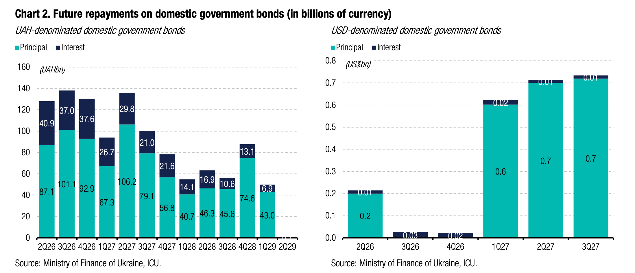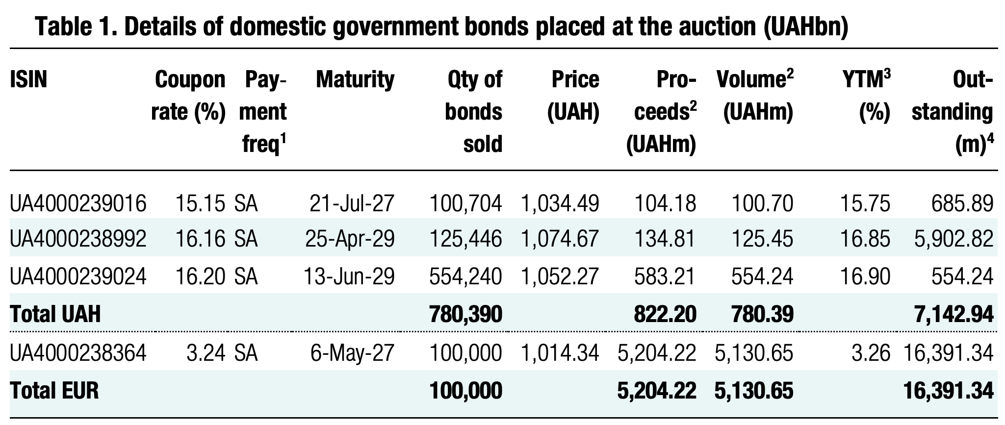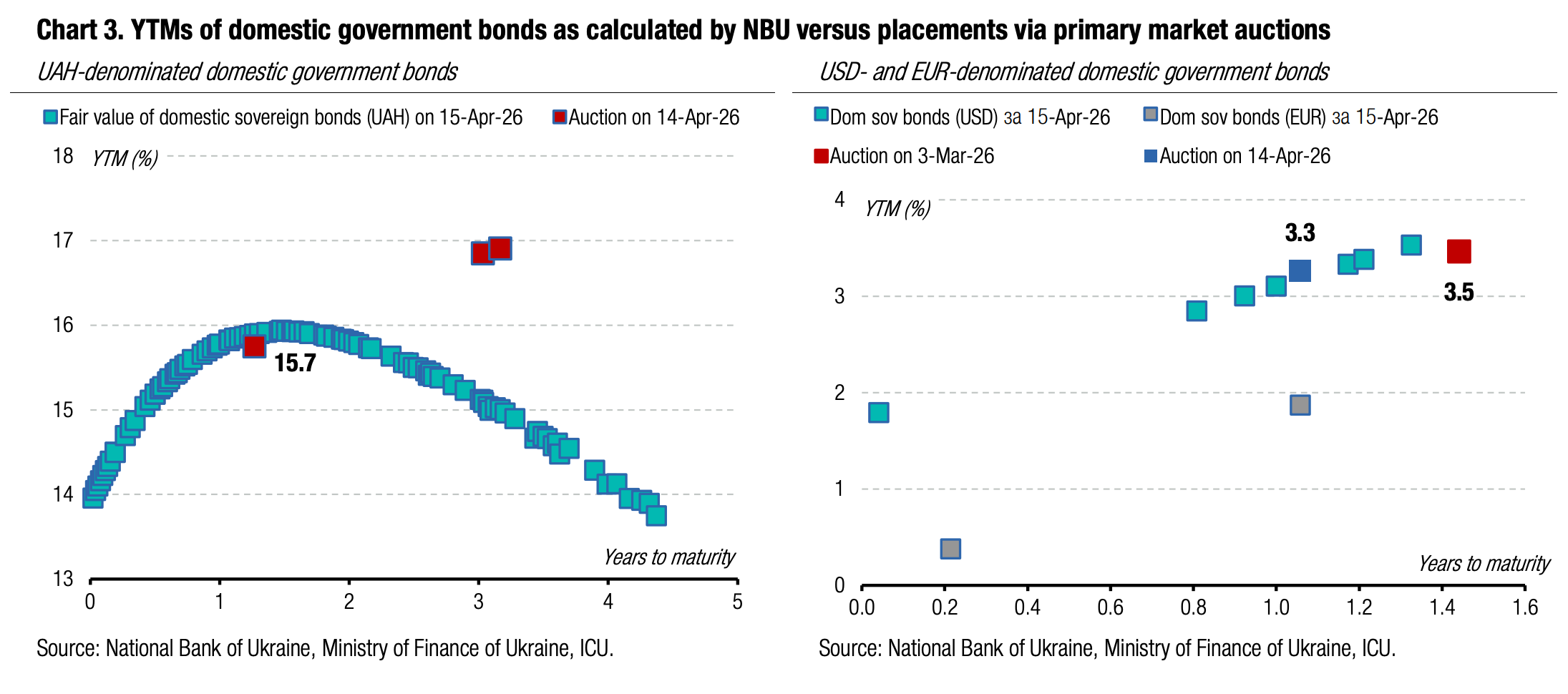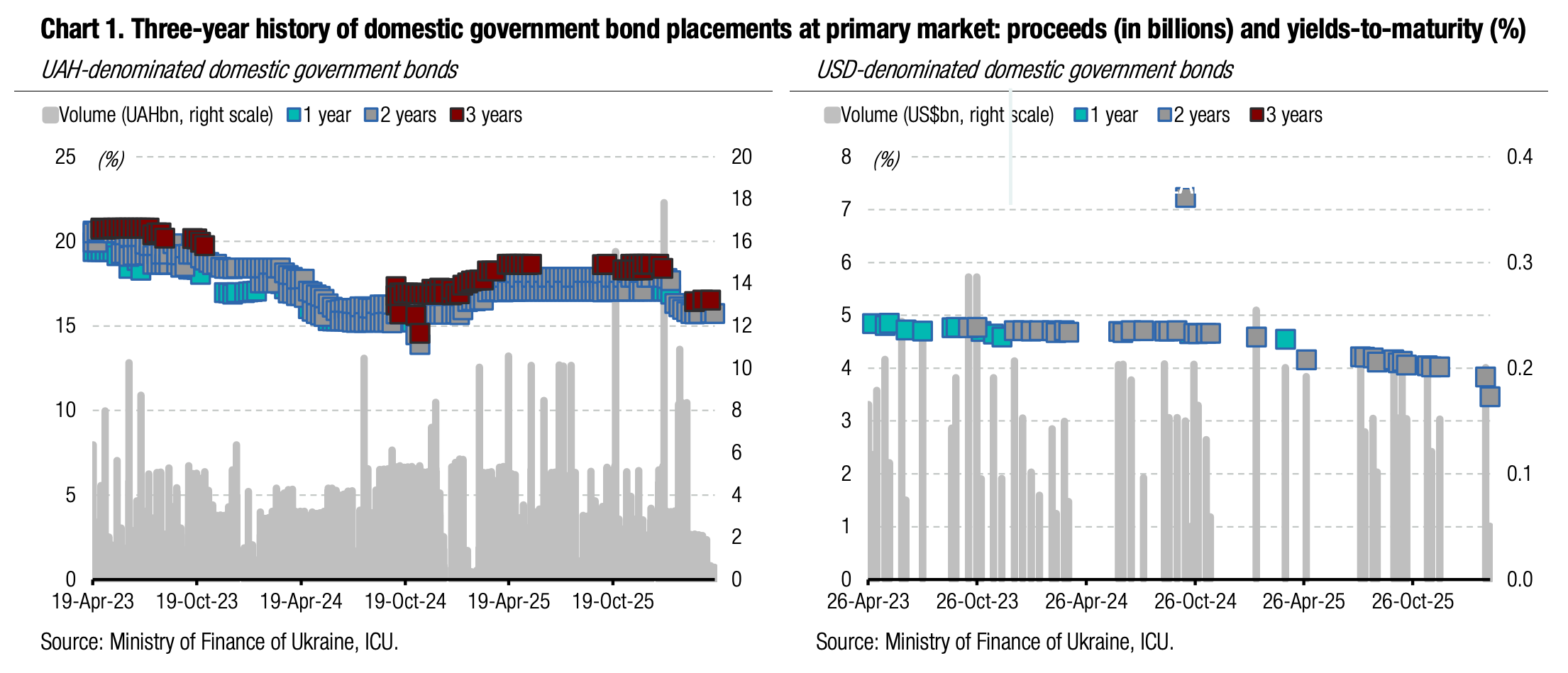 Note: [1] payment frequency abbreviations: M - monthly, Qtly - quarterly, SA - semi-annually, @Mty - at maturity date; [2] proceeds and volumes for the USD-denominated bonds are calculated based on the previous day's exchange rate 43.91/USD, 51.31/EUR; [3] yields on coupon-bearing bonds are effective yields to maturity. Sources: Ministry of Finance of Ukraine, Bloomberg, ICU.