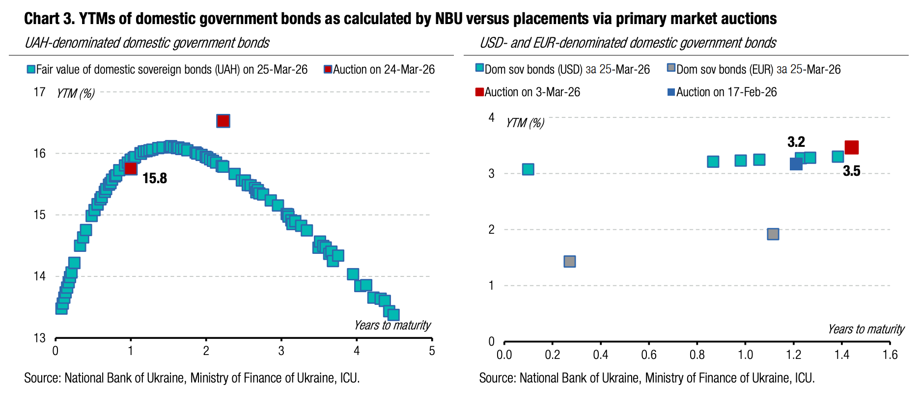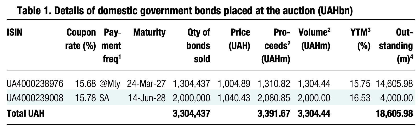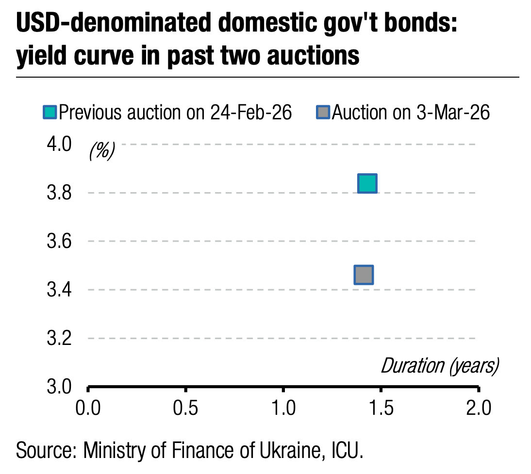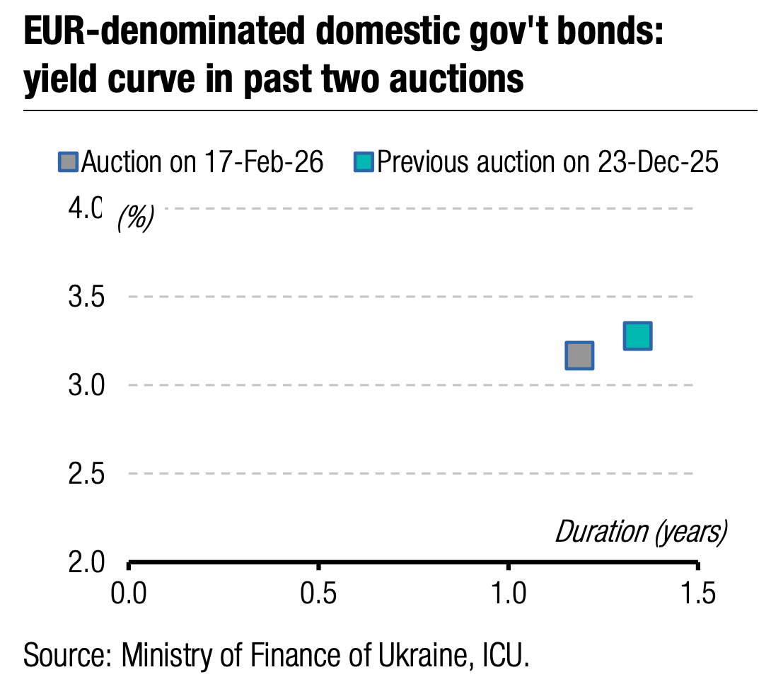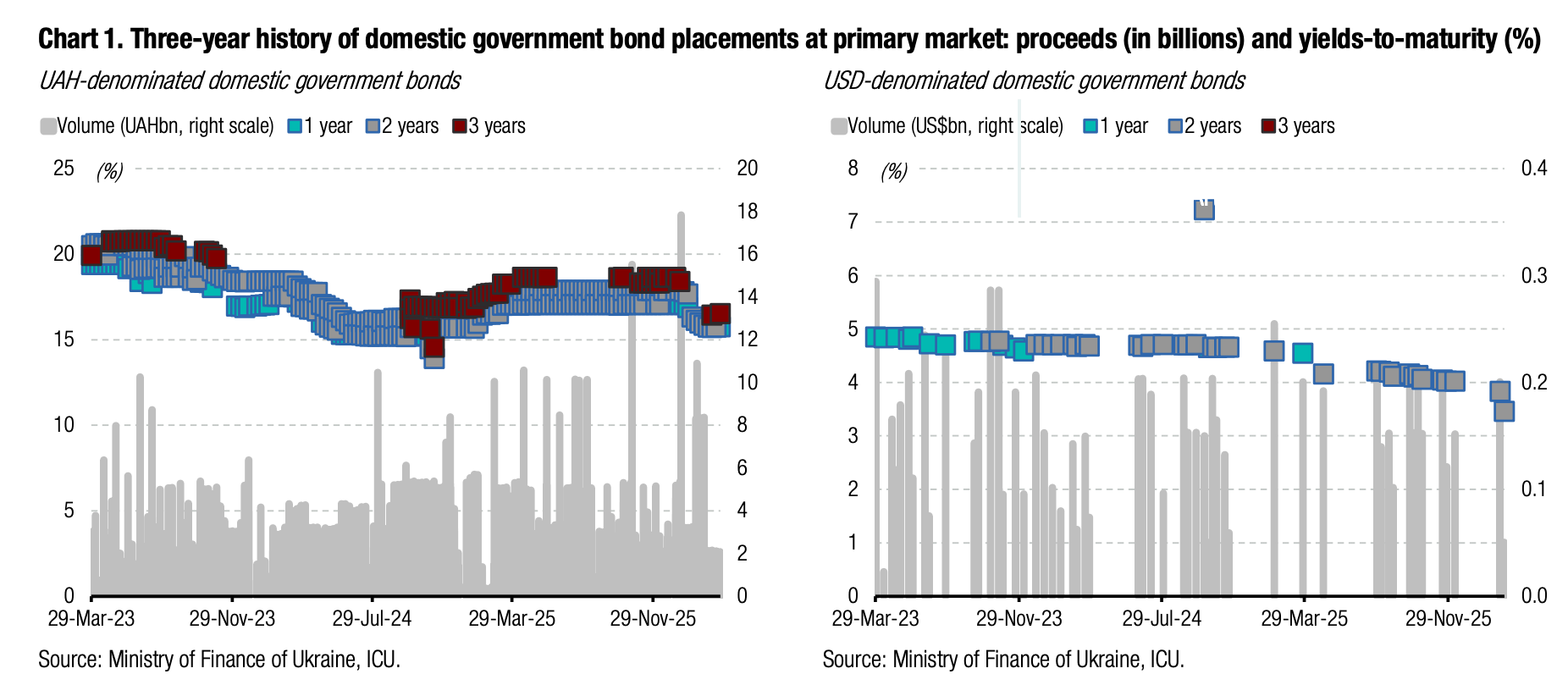 Note: [1] payment frequency abbreviations: M - monthly, Qtly - quarterly, SA - semi-annually, @Mty - at maturity date; [2] proceeds and volumes for the USD-denominated bonds are calculated based on the previous day's exchange rate 43.91/USD, 50.95/EUR; [3] yields on coupon-bearing bonds are effective yields to maturity. Sources: Ministry of Finance of Ukraine, Bloomberg, ICU.