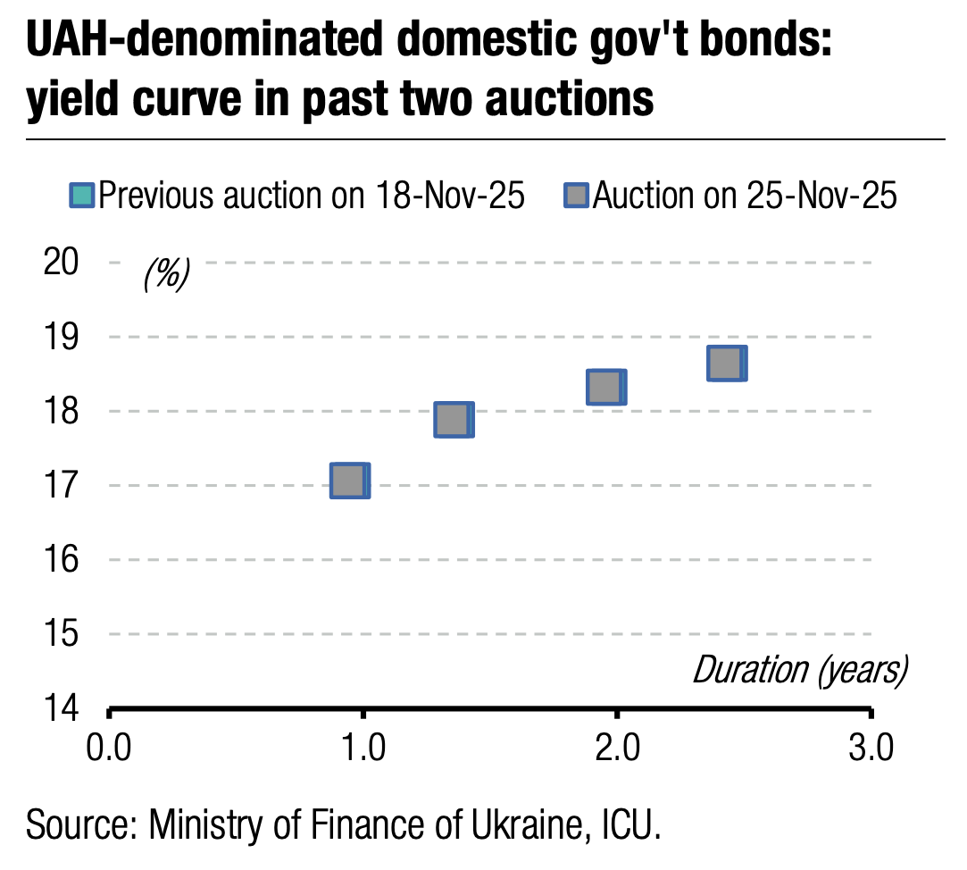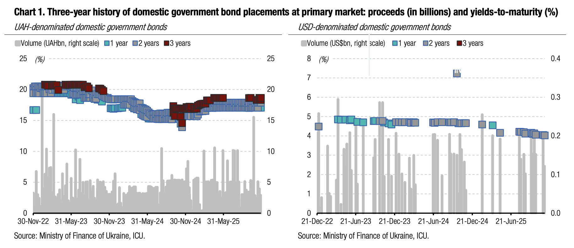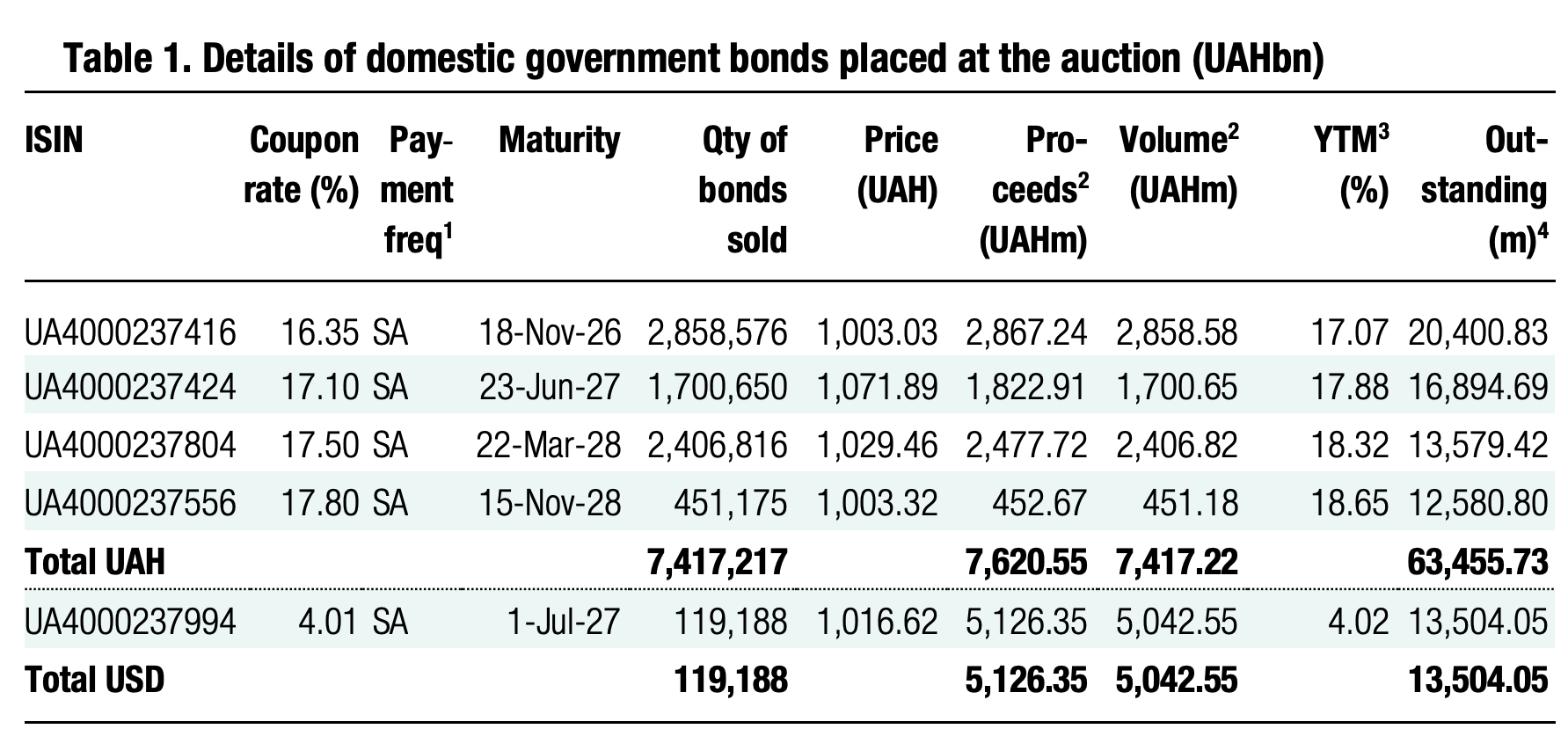 Note: [1] payment frequency abbreviations: M - monthly, Qtly - quarterly, SA - semi-annually, @Mty - at maturity date; [2] proceeds and volumes for the USD-denominated bonds are calculated based on the previous day's exchange rate 42.31/USD, 48.57/EUR; [3] yields on coupon-bearing bonds are effective yields to maturity. Sources: Ministry of Finance of Ukraine, Bloomberg, ICU.