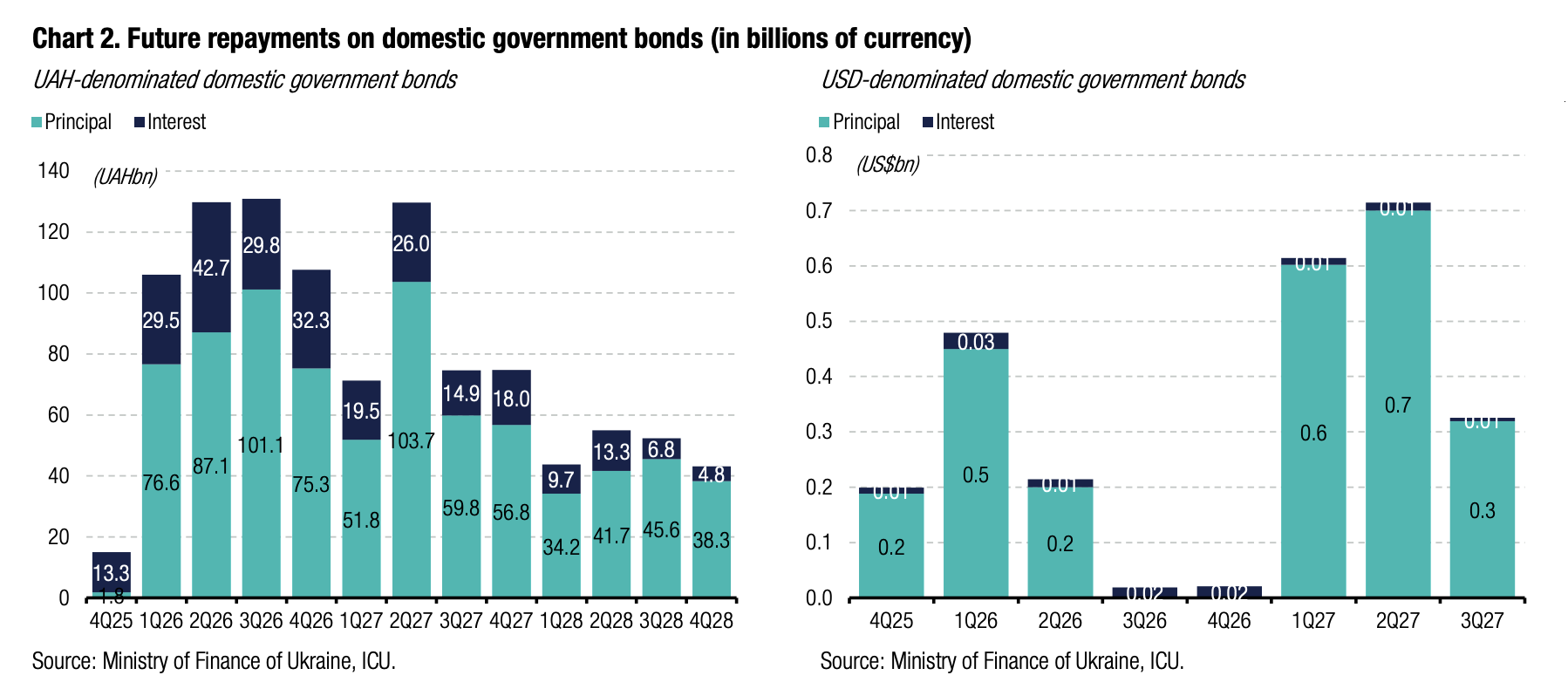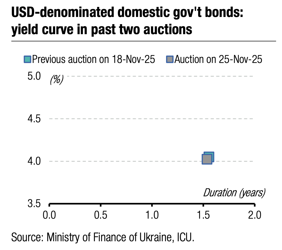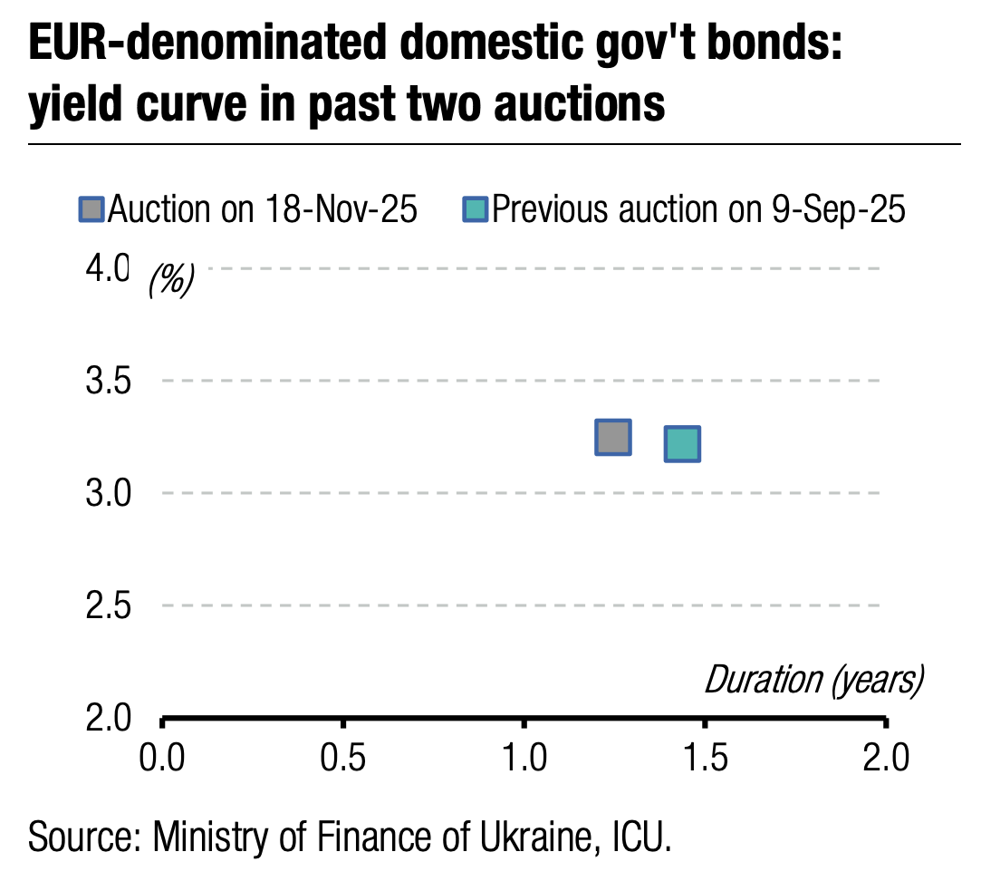 Note: [1] payment frequency abbreviations: M - monthly, Qtly - quarterly, SA - semi-annually, @Mty - at maturity date; [2] proceeds and volumes for the USD-denominated bonds are calculated based on the previous day's exchange rate 42.31/USD, 48.57/EUR; [3] yields on coupon-bearing bonds are effective yields to maturity. Sources: Ministry of Finance of Ukraine, Bloomberg, ICU.