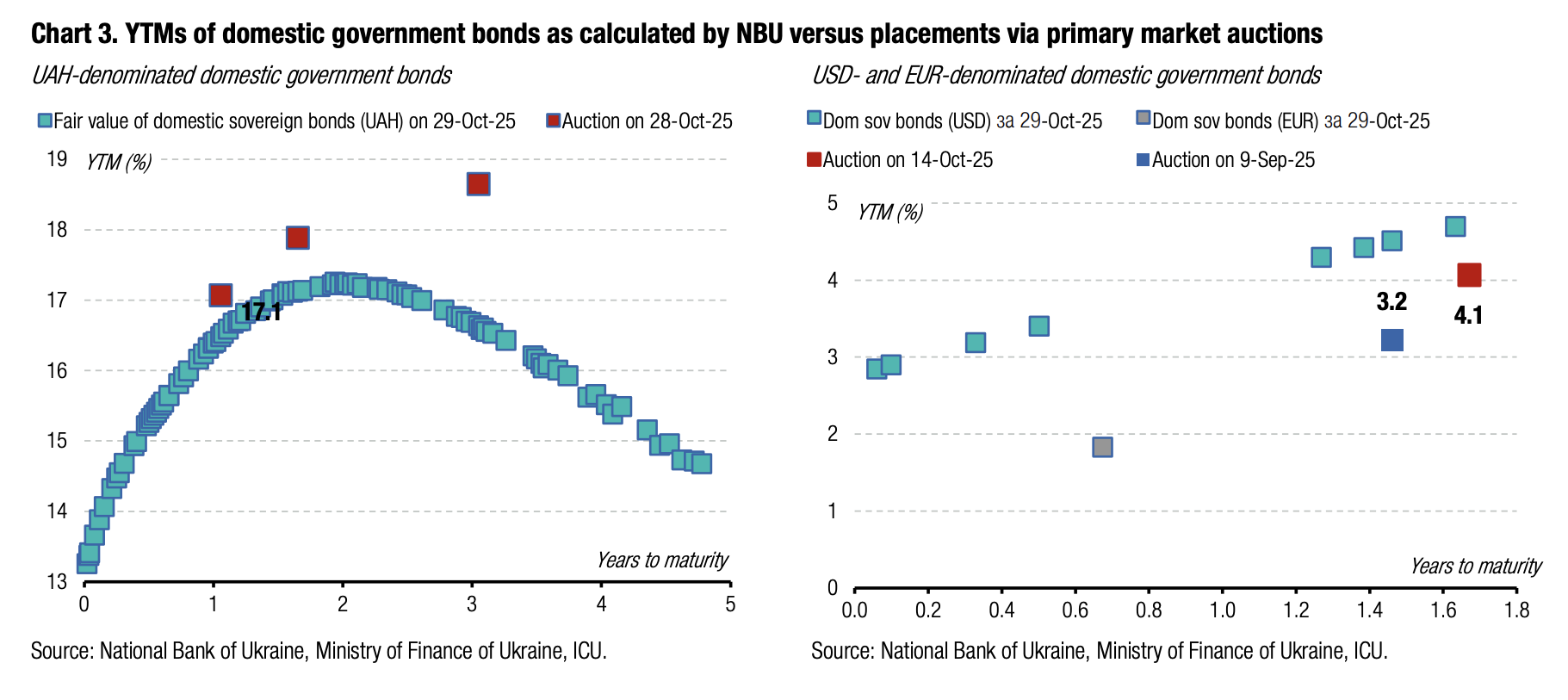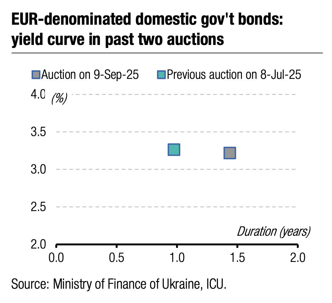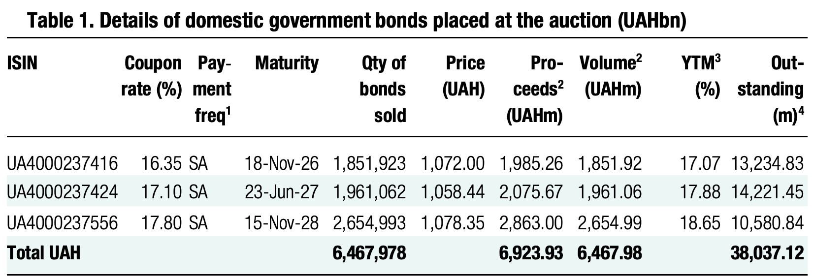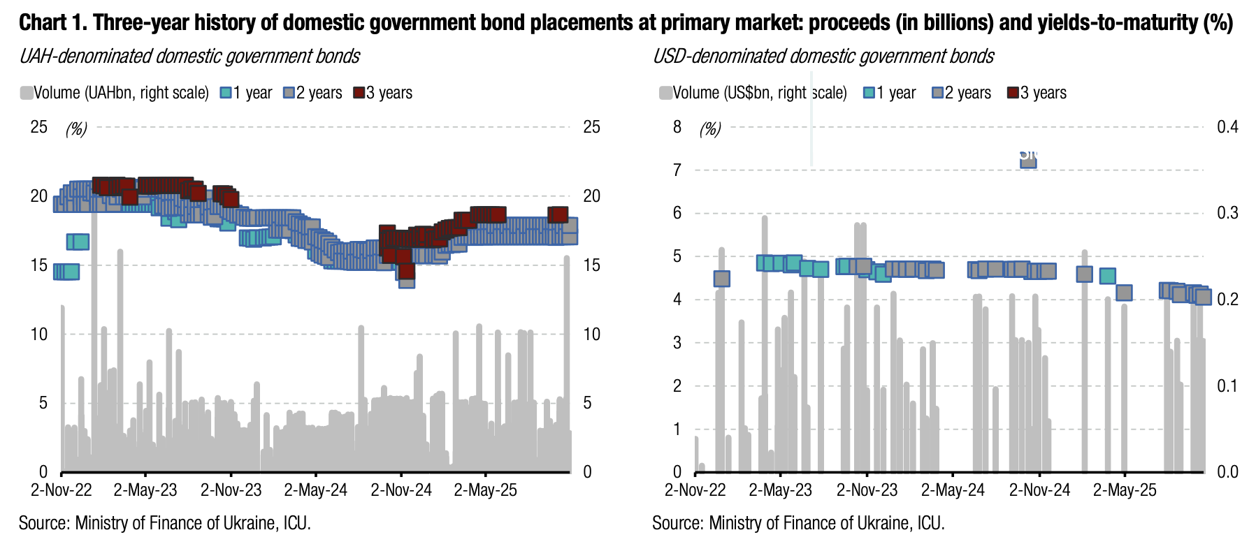 Note: [1] payment frequency abbreviations: M - monthly, Qtly - quarterly, SA - semi-annually, @Mty - at maturity date; [2] proceeds and volumes for the USD-denominated bonds are calculated based on the previous day's exchange rate 41.66/USD, 48.29/EUR; [3] yields on coupon-bearing bonds are effective yields to maturity. Sources: Ministry of Finance of Ukraine, Bloomberg, ICU.
