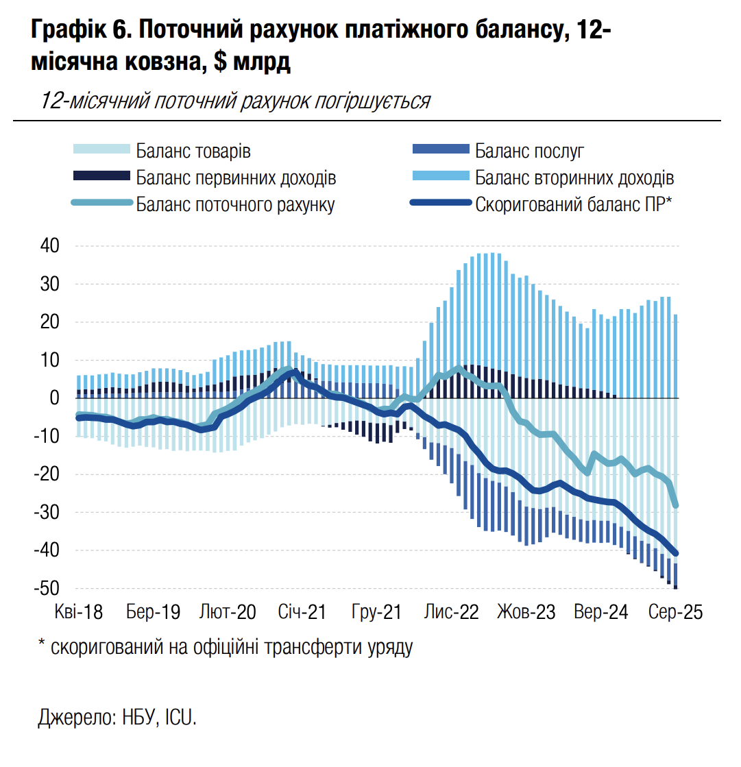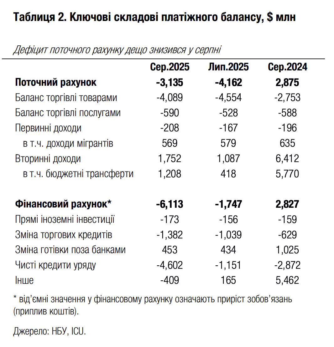 Переважно це пояснюється покращенням балансу торгівлі товарами, хоча її дефіцит і залишився високим на рівні $4.1 млрд, а за 8м25 на рівні $30.4 млрд порівняно з $20.2 млрд за 8м24. Експорт товарів у серпні був слабким і знизився на 9% р/р (-4% р/р за 8м25) переважно через зниження продажів за кордон агропродукції. Імпорт і надалі зростав двознаковими темпами (+17.5% р/р у серпні та +19.8% за 8м25). Дефіцит торгівлі послугами та дефіцит рахунку первинних доходів майже не змінився як порівняно з липнем, так і серпнем минулого року. Значний профіцит рахунку вторинних доходів був ключовим фактором покращення балансу поточного рахунку в серпні завдяки трансфертам зовнішньої грантової допомоги на рахунки уряду.