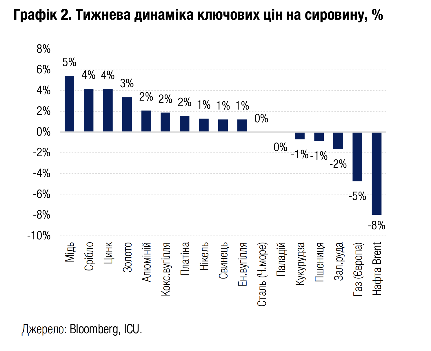На ринках сировини в лідерах тижневого зростання опинились ціни на мідь (+5%) через зупинку на невизначений термін однієї з найбільших мідних шахт світу Grasberg в Індонезії. Водночас ціни на нафту впали найбільше (-8%) через очікування подальшого збільшення видобутку країнами ОПЕК, а також перспективи близької мирної угоди між Ізраїлем та угрупуванням Хамас.