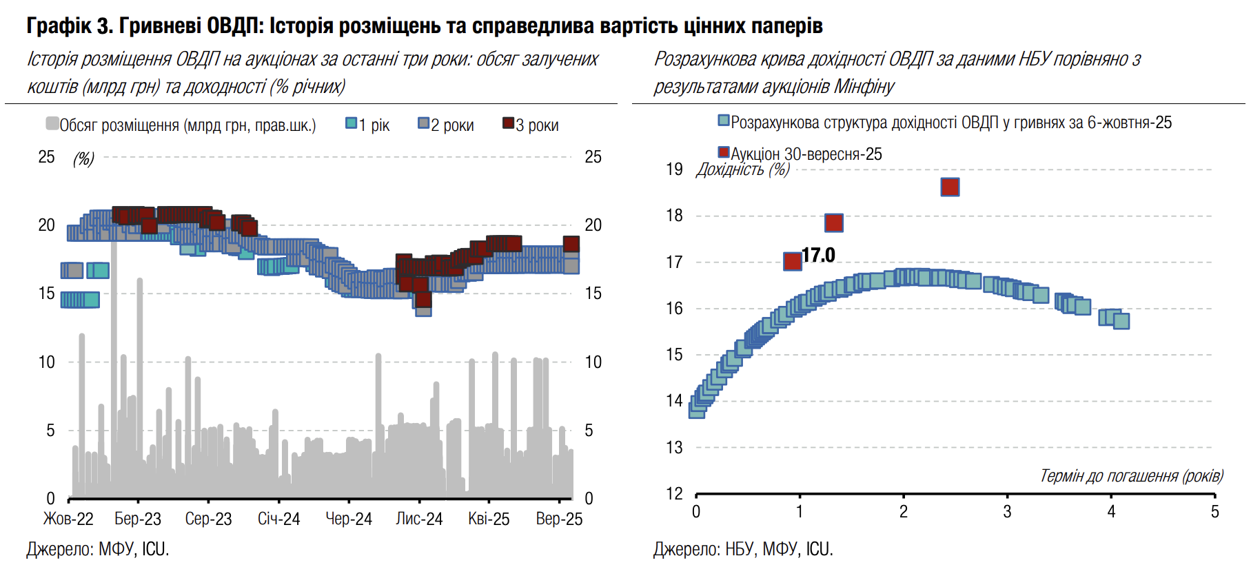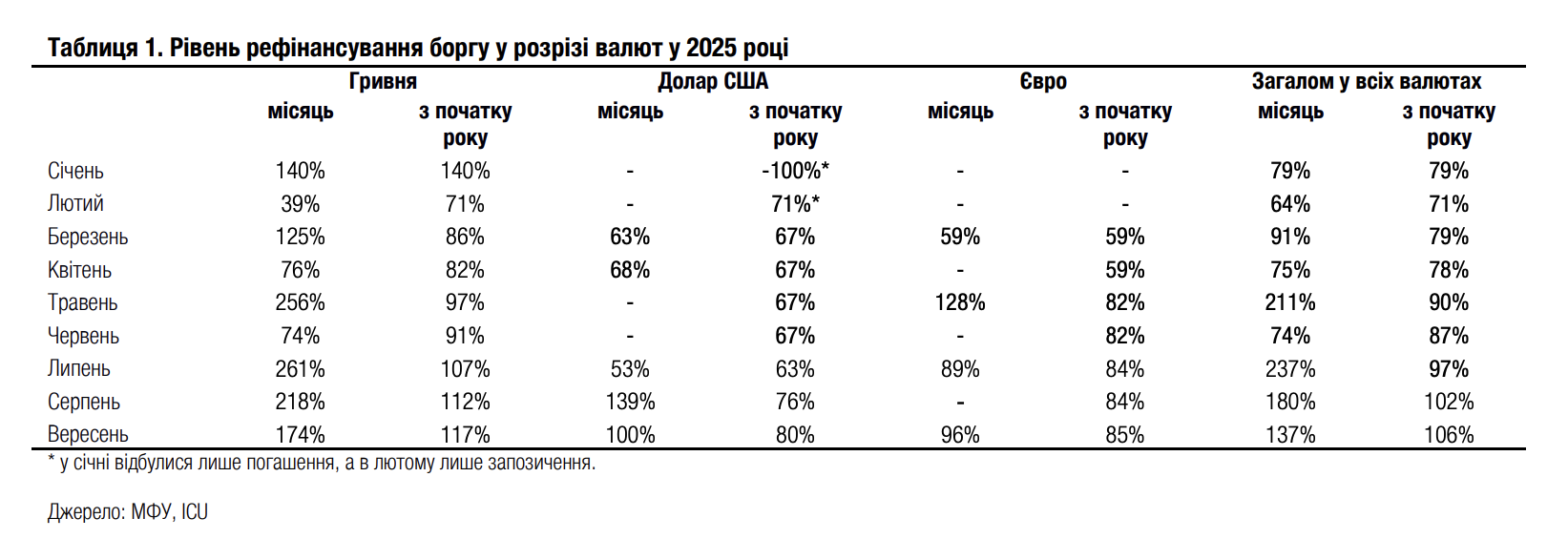 Упродовж вересня Міністерство фінансів розмістило нових облігацій у різних валютах загальним обсягом 51 млрд грн, що дозволило на декілька відсоткових пунктів покращити роловер порівняно з 8м25. За підсумками 9м25 роловер гривневого боргу покращився на 4 в.п. до 117%, боргу в доларах США також на 4 в.п. до 80%, а боргу в євро лише на 1 в.п. до 85%. Загальний рівень рефінансування внутрішнього боргу покращився на 4 в.п. до 106%. У вересні Мінфін уперше цього року здійснив 100% рефінансування погашення валютних ОВДП, адже в серпні високий показник роловеру пояснювався реінвестуванням коштів, отриманих від липневого погашення.