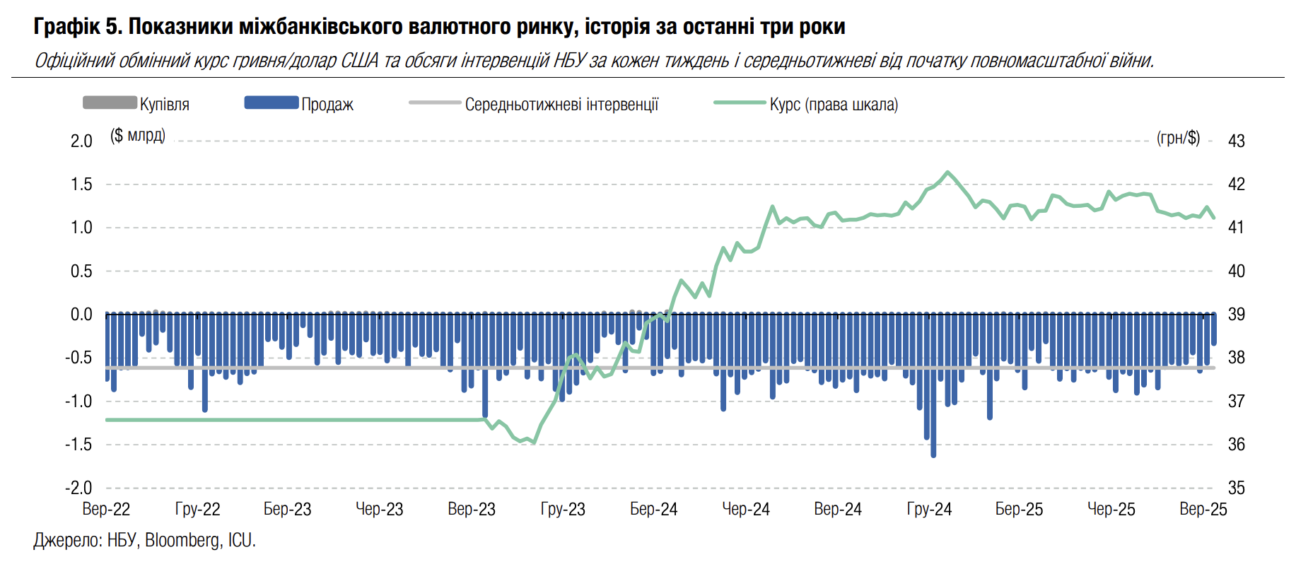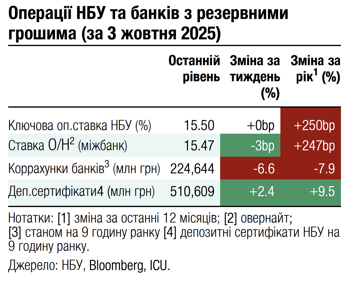 Погляд ICU: Наприкінці вересня відбувалася сплата ПДВ та акцизу за серпень, що могло потребувати продажу експортерами додаткового обсягу валютної виручки. Тож у ці дні міжбанківський ринок потребував мінімального втручання НБУ. Однак це тимчасове покращення, і ми очікуємо повернення інтервенцій до обсягів $500-600 млн за тиждень, тобто близьких до середньотижневого показника за час повномасштабної війни.