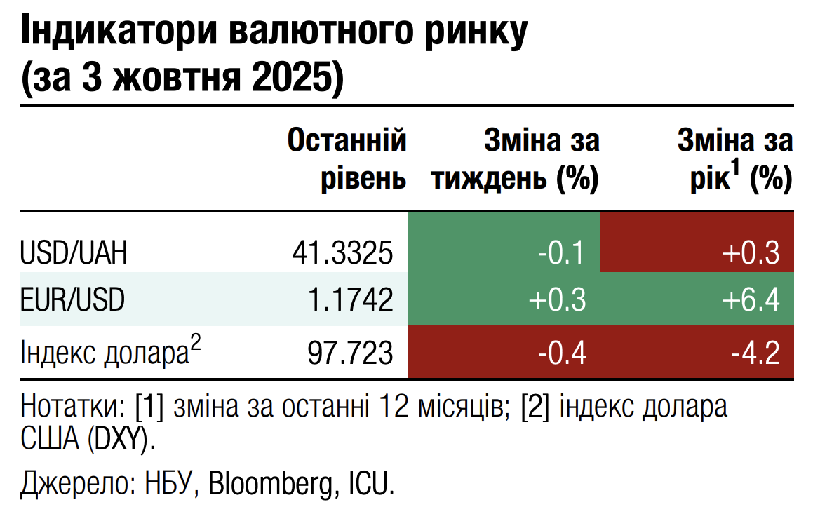 На початку минулого тижня клієнти банків (юрособи) суттєво збільшили продаж валюти, а в понеділок навіть продавали більше, ніж купували. Однак уже з початку жовтня продаж валюти знову зменшився, і за чотири робочі дні усе ж сформувався дефіцит валюти на міжбанківському ринку обсягом $47 млн. Попри це, нетривалий період профіциту пропозиції валюти дозволив Національному банку повернути курс долара до менш ніж 41.3 грн/$. На сьогодні НБУ встановив офіційний курс 41.23 грн/$. Також це посприяло зменшенню продажу валюти з міжнародних резервів до $333 млн за тиждень, що є мінімумом із квітня.