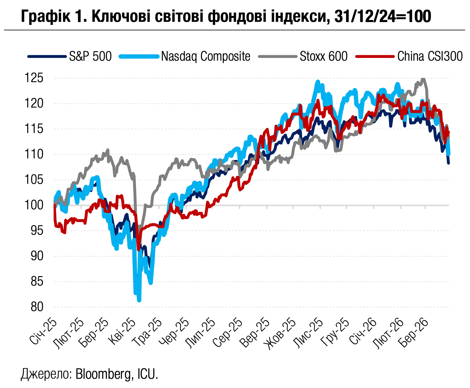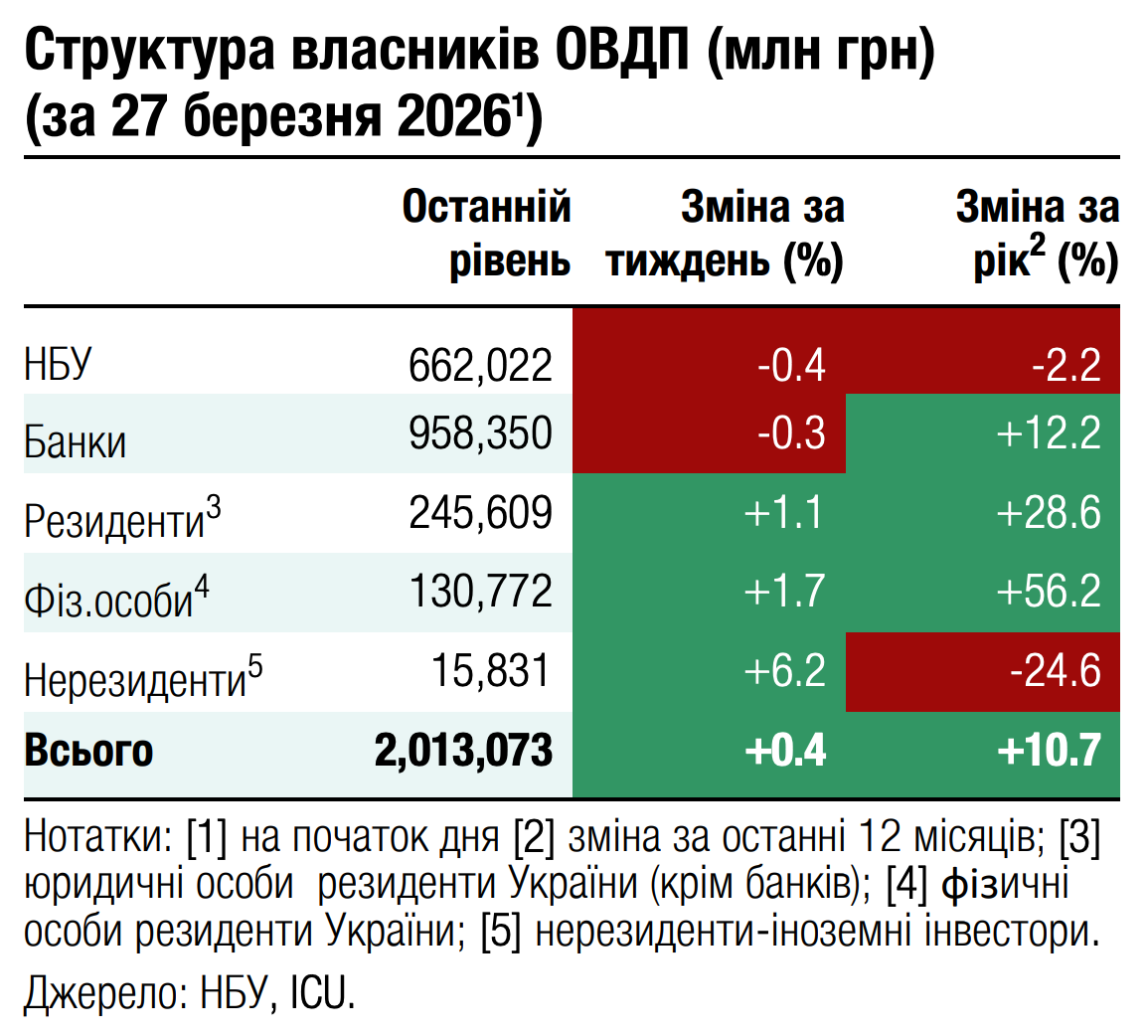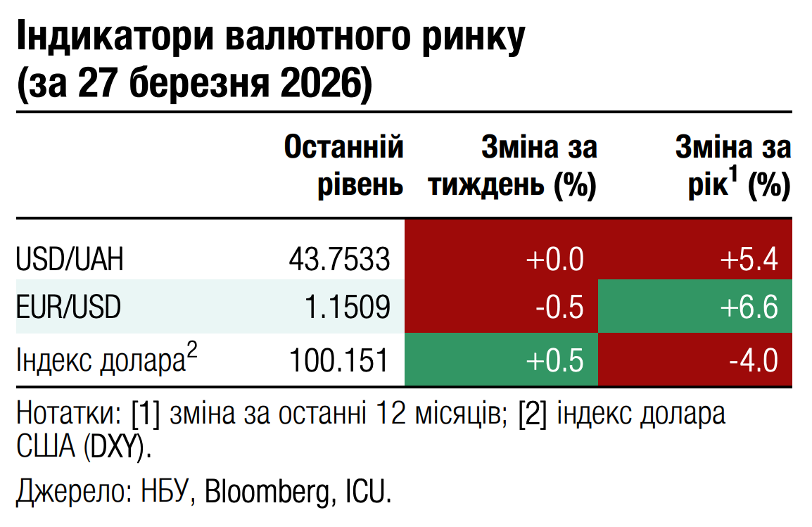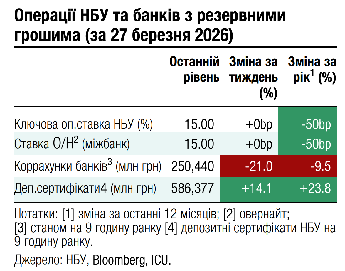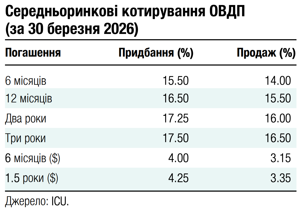 За час від початку війни в Ірані глобальний сентимент до ринків, що розвиваються, поступово погіршувався. Індекс облігацій таких країн, EMBI, впав за цей період більш ніж на 4%. Припинення мирних переговорів щодо війни в Україні лише додало негативу, тож ціни українських єврооблігацій знизилися з початку березня майже на 14%. Ще одним негативним фактором є затримка з фінансуванням ЄС через вето Угорщини та повільний прогрес реформ в Україні.