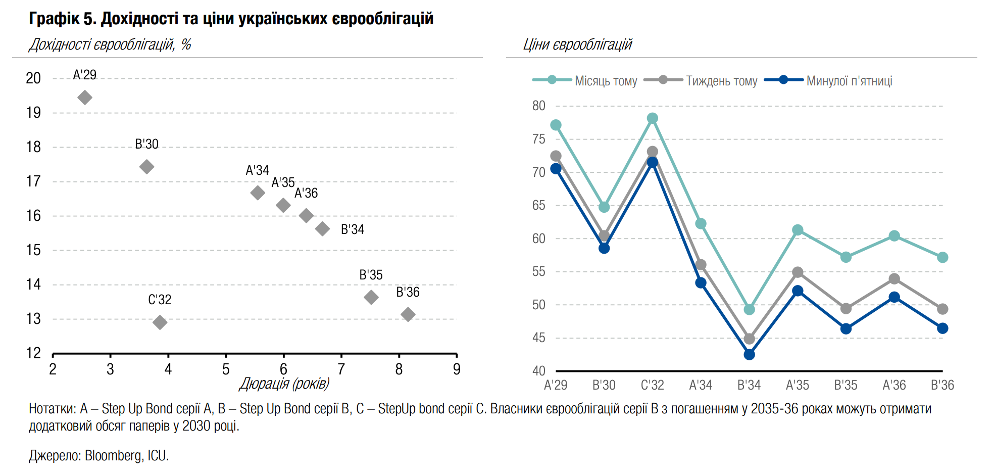 Погляд ICU: Інвестори в українські єврооблігації бачать дедалі менше підстав для оптимізму в частині досягнення обрисів мирного договору – швидше, навпаки, через тривалу війну в Ірані перспектива відновлення тристоронніх переговорів стає все більш примарною. Погіршення глобального сентименту до ринків, що розвиваються, продовжить тиснути й на українські євробонди.