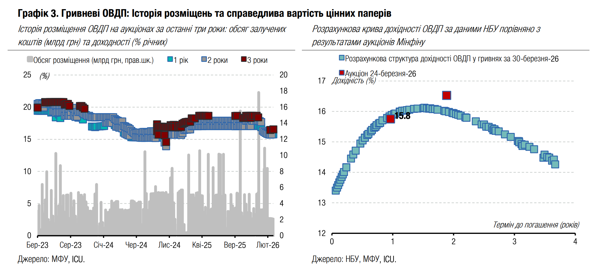 Погляд ICU: Рішення НБУ не змінювати облікову ставку стало фактором стабілізації відсоткових ставок на первинному ринку. Найімовірніше, обсяг заявок з дохідностями, нижчими від максимальних задоволених ставок, зменшиться – і ми спостерігатимемо стабілізацію дохідностей на поточних рівнях. Поточні ставки можуть зберігатися принаймні в найближчі місяці, поки не з’являться передумови для подальшого пом'якшення монетарної політики. У комунікації за результатами засідання Комітету з монетарної політики НБУ також зауважував, що в разі зростання ризиків облікова ставка може зрости. Все ж у поточних умовах ми не очікуємо підвищення дохідностей ОВДП найближчим часом.