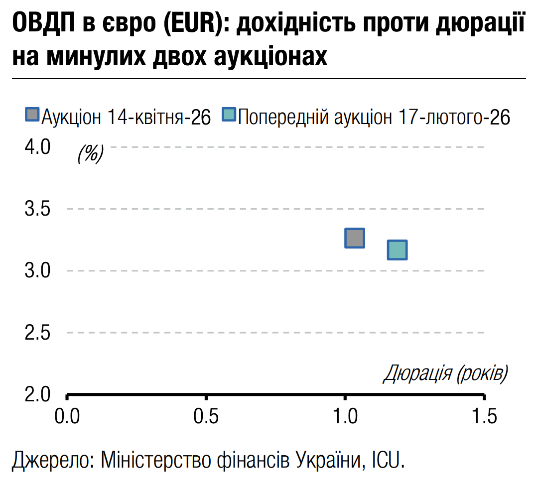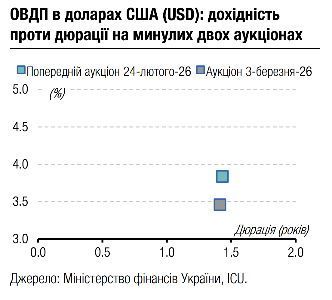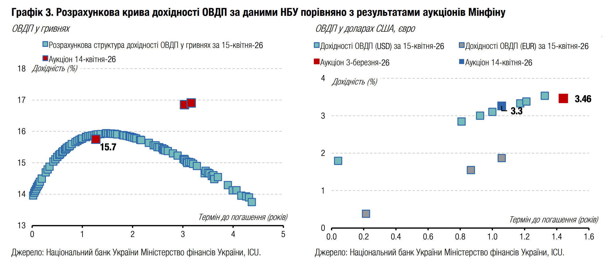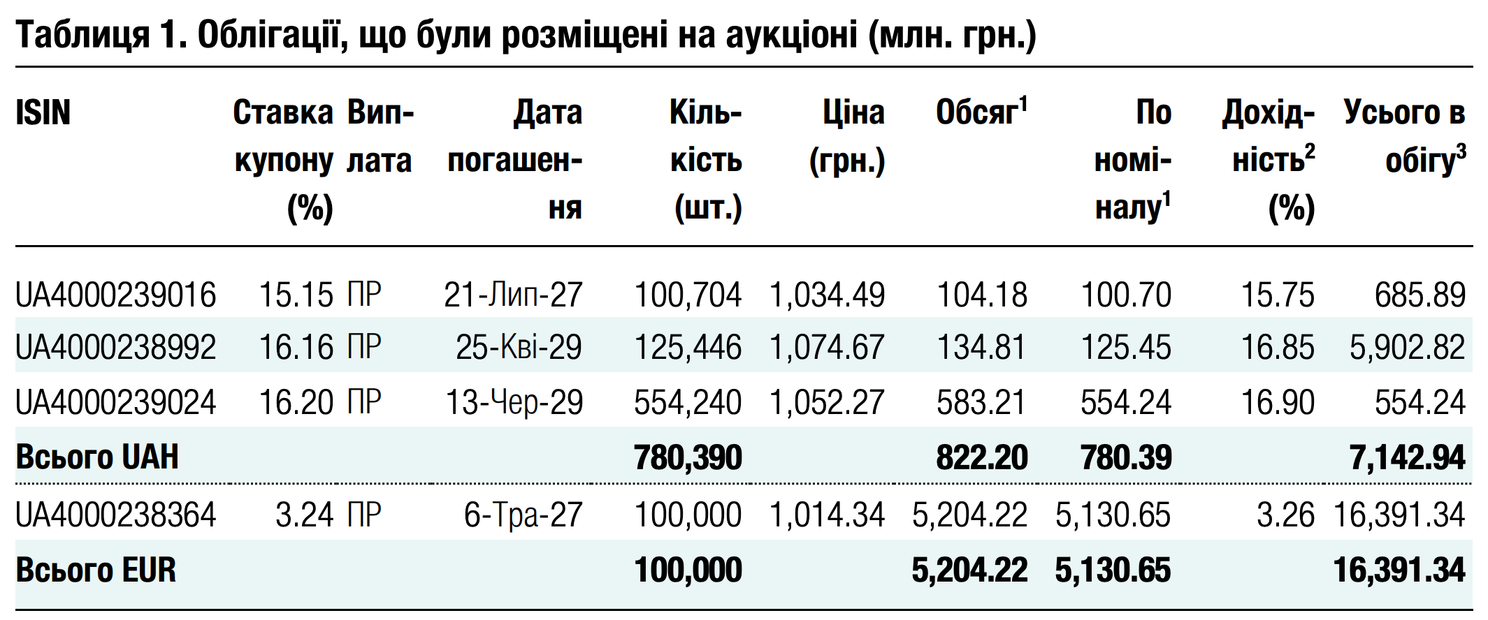 Примітка: [1] по валютних ОВДП обсяг залучених коштів та номінальний обсяг облігацій, що були випущені, наводиться у гривневому еквіваленті за ринковим курсом 43.91/USD, 51.31/EUR;[2] по облігаціях із строком обігу 1 рік і більше наводиться ефективна дохідність до погашення; скорочення в графі "Виплата": К - квартальна виплата купону, ПР - виплата купону кожні півроку, Д - дисконтна облігація з нульовою ставкою купона. Джерела: Міністерство фінансів України, Bloomberg, ICU.